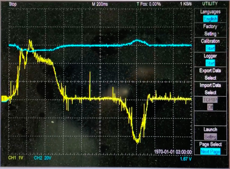 На графиках представленных на видео очень хорошо видны амплитуды токов. Обратите внимание на то, что токи разгона и торможения практически равны по величинам. Видна разная длительность фазы разгона и торможения. Причина этому — только в медленной реакции ноги при нажатии на педали. Привод успевает существенно замедлится при перекладки с газа на тормоз. Без нагрузки агрегат разгоняется и тормозит очень быстро, и нога просто не успевает мгновенно и плавно перейти с одной педали на другую. На прошлом видео было видно как 100 килограммовый девайс прыгает на тележке во время разгонов и торможений.
