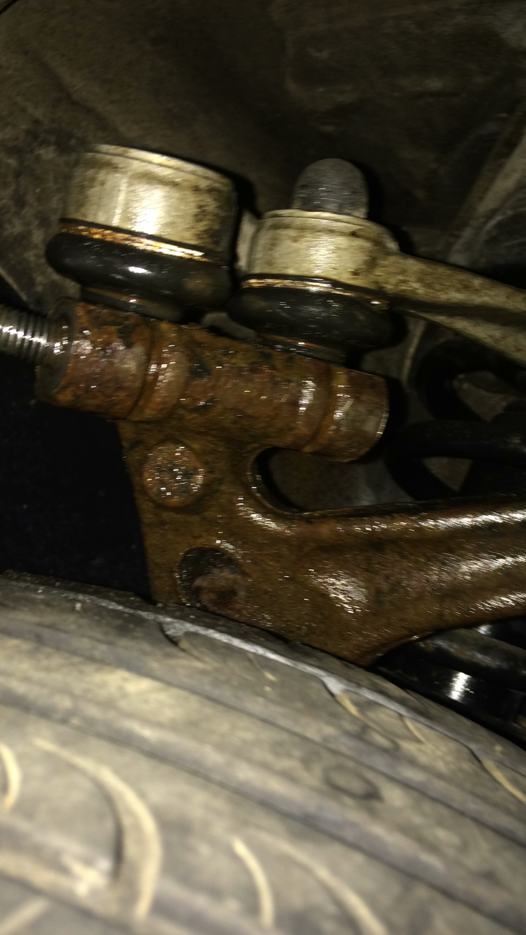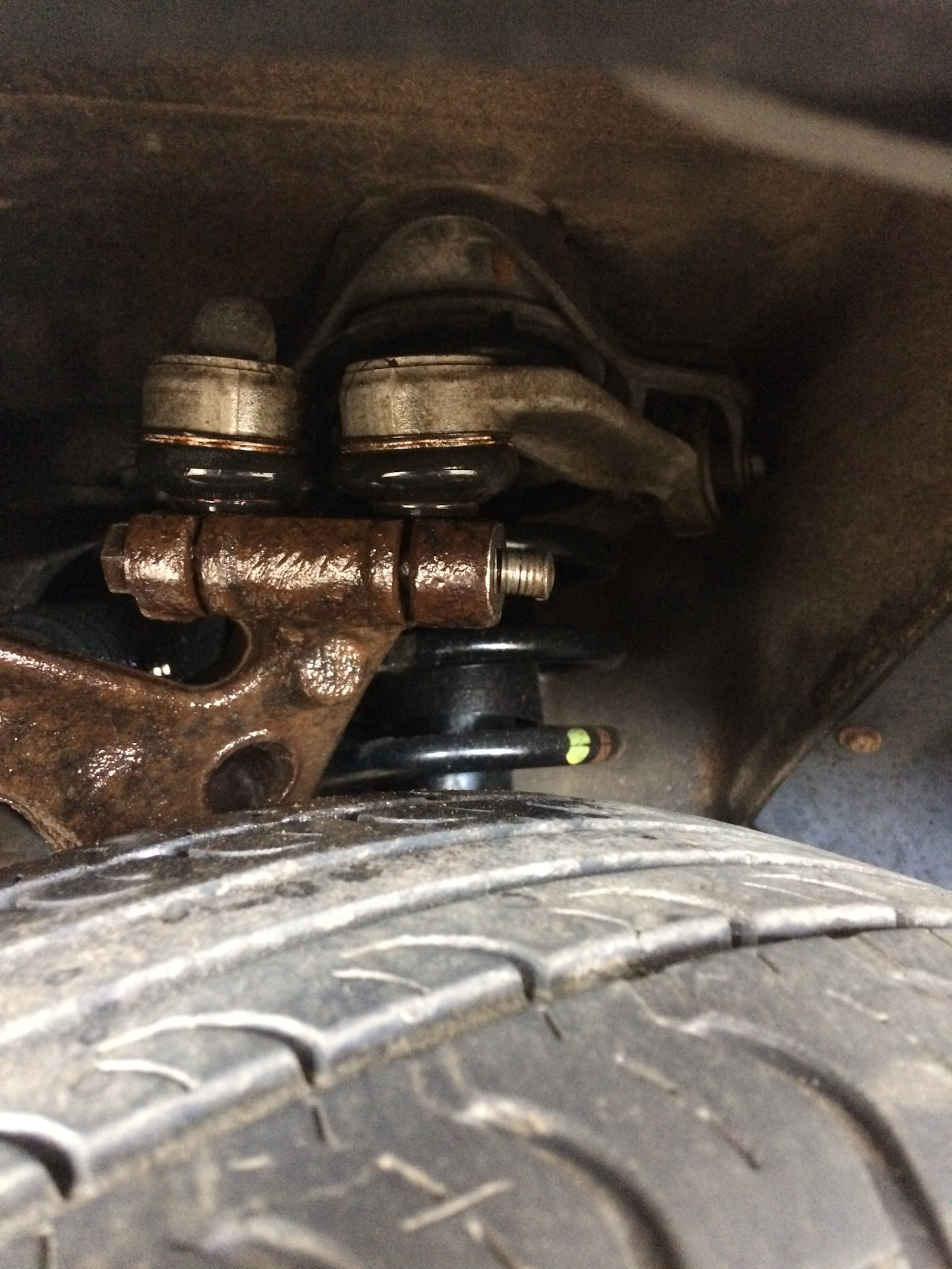 — попытка преднатянуть с другой стороны за гайку не увенчалась успехом, приваривал к болту гайку, и бур перфоратора(один преднатягивает, второй аккуратно стучит перфоратором в режиме отбойного молотка), сдвинул лишь часть до прорези шаровой переднего рычага.