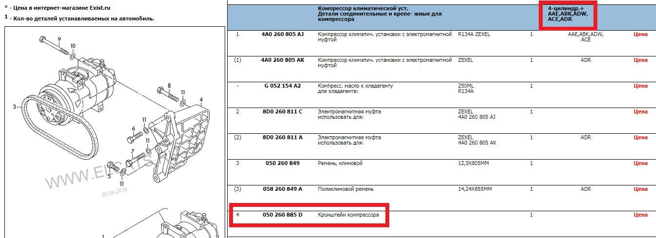 Начну с того, что кронштейн компрессора от ADR совершено не подошел на блок AAD/АВК. Вызвано это тем, что при покупке я ориентировался на схемы ЕТКА, в которых для всех 4-х цилиндровых двигателей (AAE, ABK, ACE, ADW, ADR) указан один и тот же номер кронштейна 050 260 885 D. Поэтому смело брал его и компрессор от ADR.