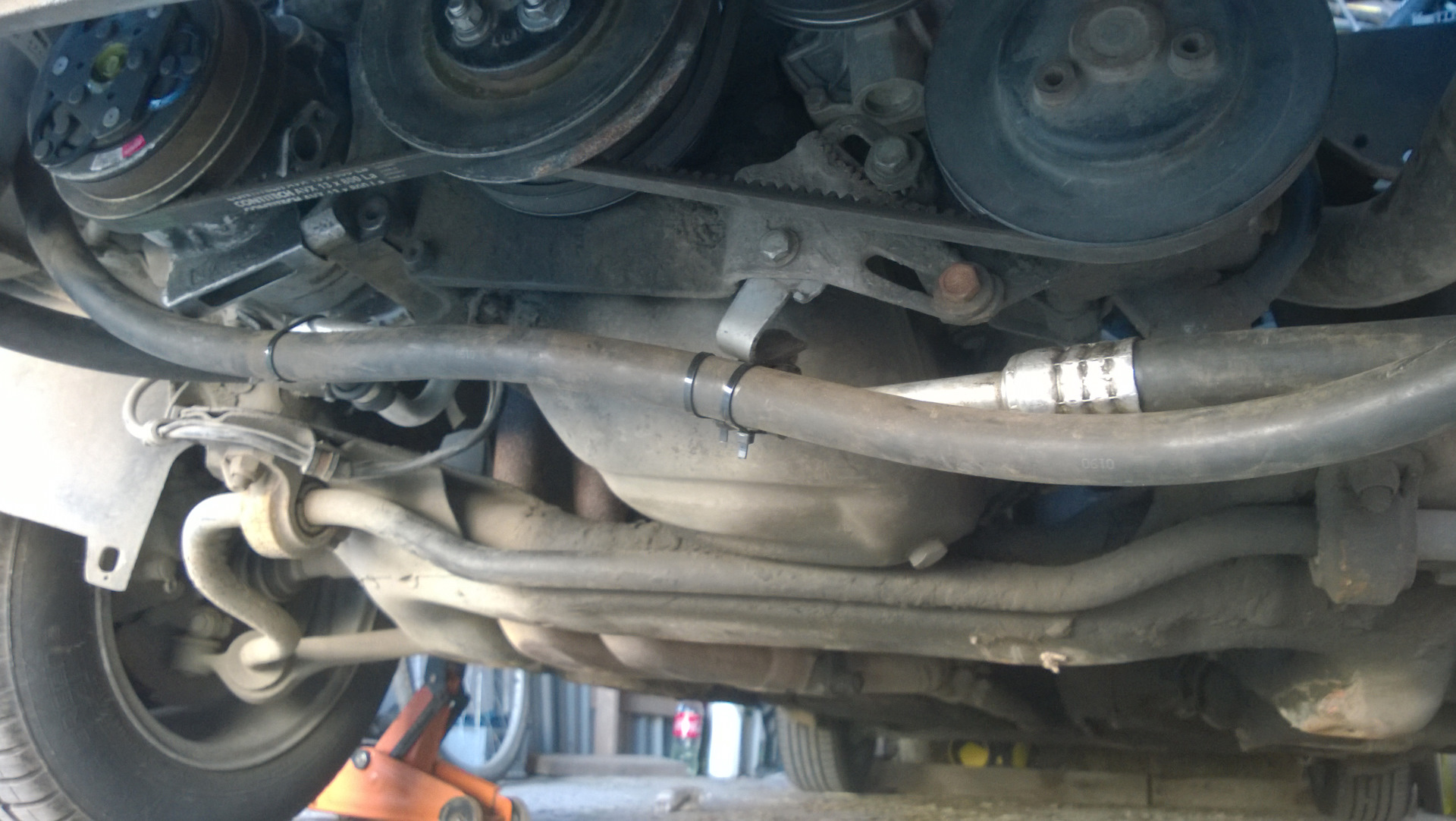 Не нашел самое нижнее крепление трубки к кронштейну ГУРа, поэтому пришлось мастырить из кронштейна какой-то другой трубки. В итоге снизу магистрали выглядят так: