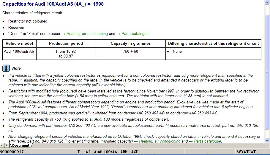 Хотя сейчас вчитался в комментарии под табличкой и, кажется, понял в чем прикол. До сентября 1994 для 134а ставили конденсеры с номером 4А0 260 403 АВ, а затем заменили их на 4А0 260 403 АС. Емкость системы изменилась с 600 на 750.