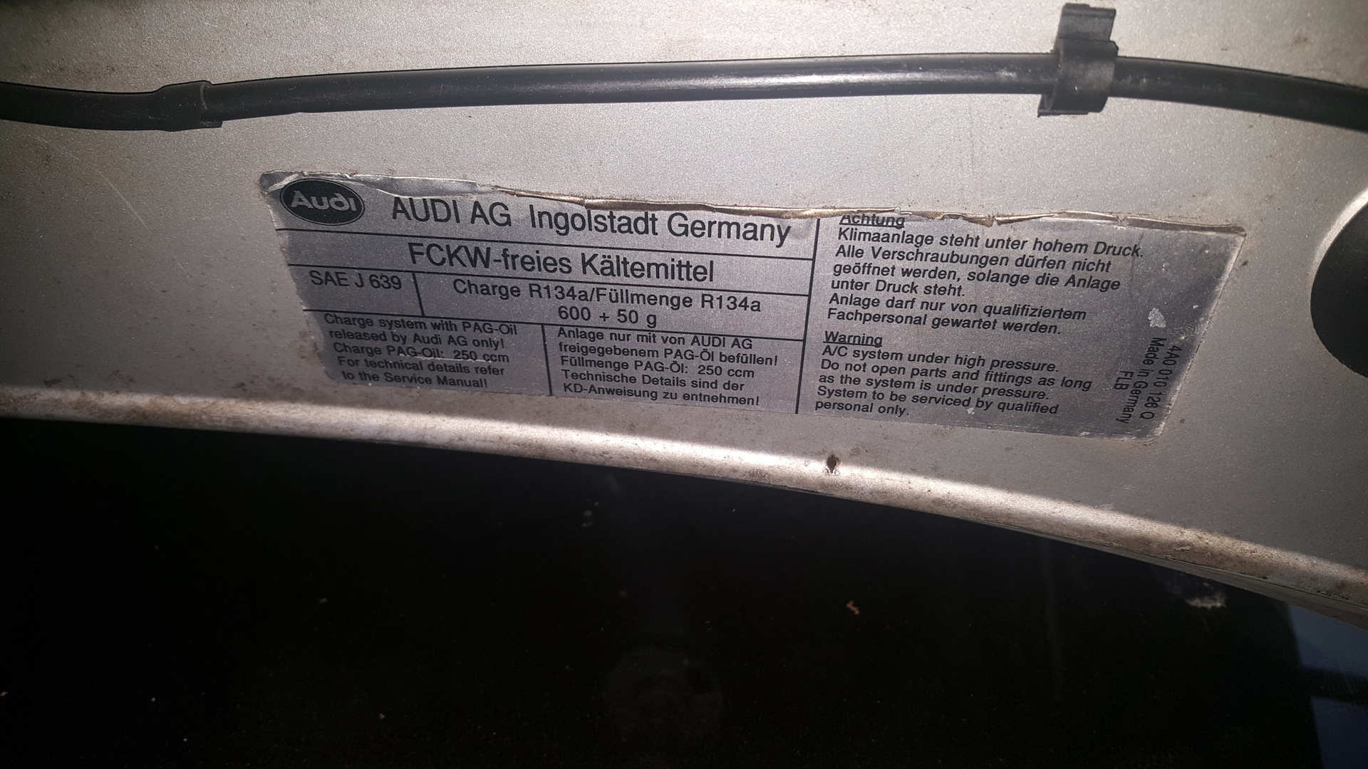 Но это очень странно, что на наклейке написано 600+50, поскольку на всех 100/А6 c r134a вне зависимости от типа двигателя согласно ельзе должно быть 750+50. И бирка 8A0 010 126 P, которая по каталогам лепится нам, гласит 750+50.