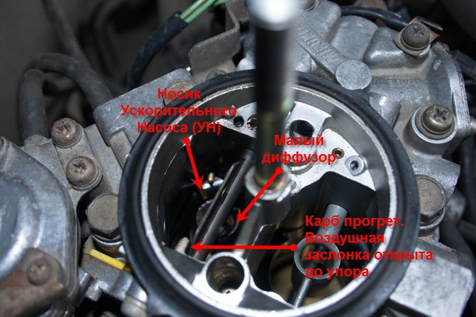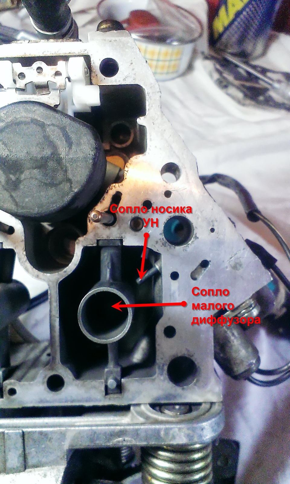 Заводим двиг. Если есть подозрение на перелив, то заглядываем с фонариком в первую камеру карба и смотрим, брызжет ли бензин из малого диффузора или из носика УН.
