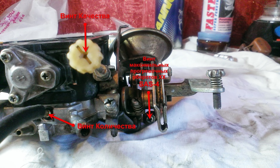 1. Выкручиваем Винт Качества так, чтобы он не влиял на дроссельную заслонку. При этом обороты могут подняться выше 2000. Ничего страшного.