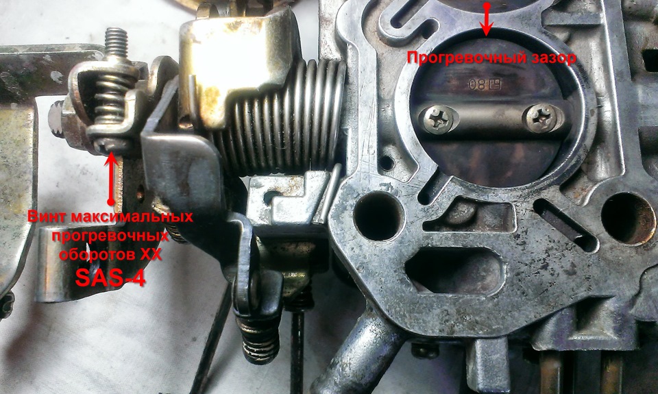 Причина 1: Перезакручен Винт Регулировки Прогревочных Оборотов SAS-4. На холодном карбе дроссельная заслонка имеет прогревочный зазор, который обеспечивает увеличенные (прогревочные) обороты в режиме холостого хода. На отрегулированном карбе после прогрева дроссельная заслонка полностью закрывается. Это делает биметаллическая пластина, расположенная на оси дроссельной заслонки. Но если винт SAS-4 слишком сильно закручен, то после прогрева дроссельная заслонка оказывается чуточку приоткрытой… аналогично тому, как если бы педаль газа была бы все время слегка нажата.