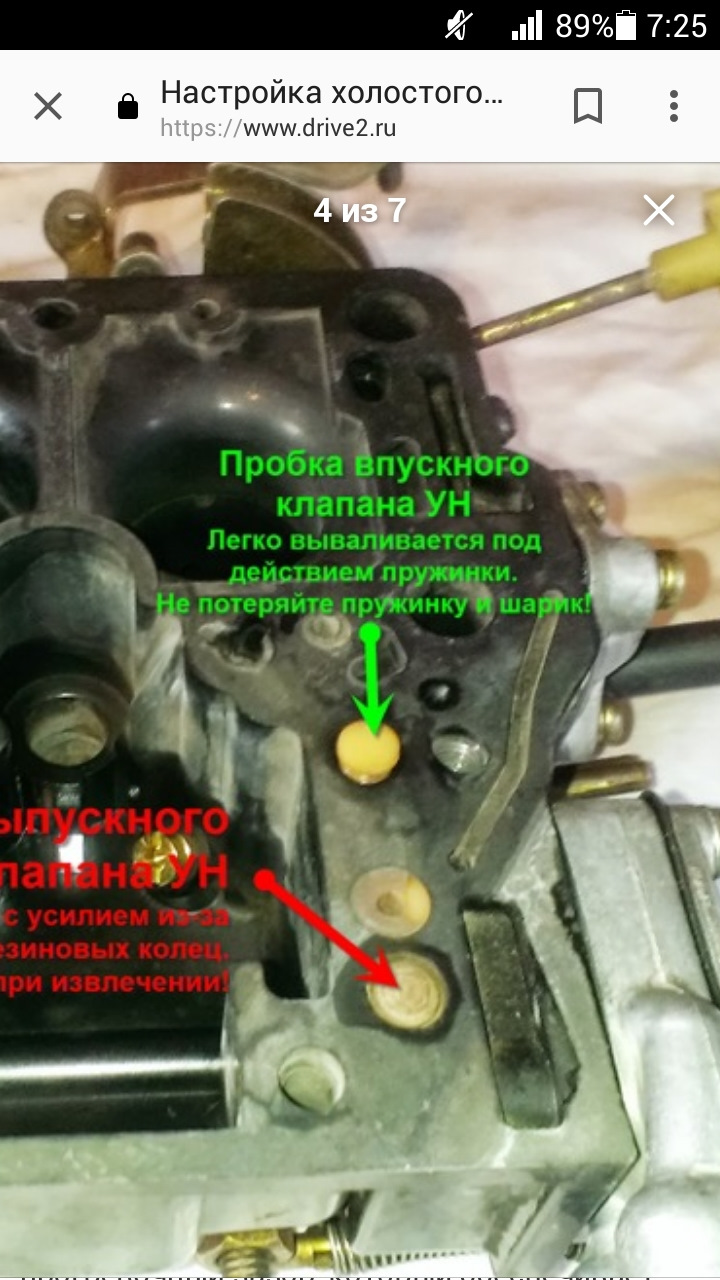 Что делать: Надо разбирать карб, вытаскивать пластиковую пробку выпускного клапана УН, менять резиновые колечки на пробке и мыть каналы УН.