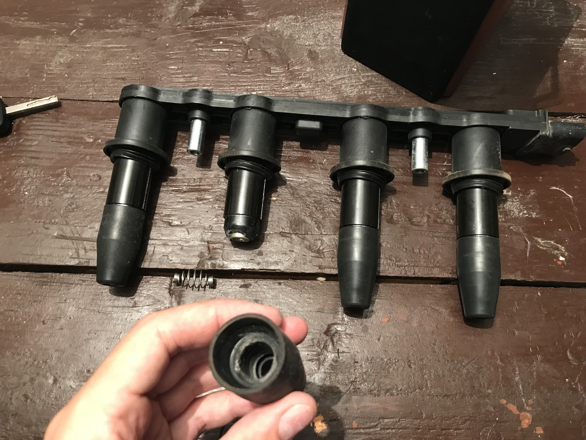 Вобщем доплёлся до гаража на трёх цилиндрах, проверил ошибки в итоге 30101 пробой первого, снял модуль, думаю поищу место пробоя, в итоге хотел снять колпачек, итог на фото, ещё и второго…фиаско вобщем,