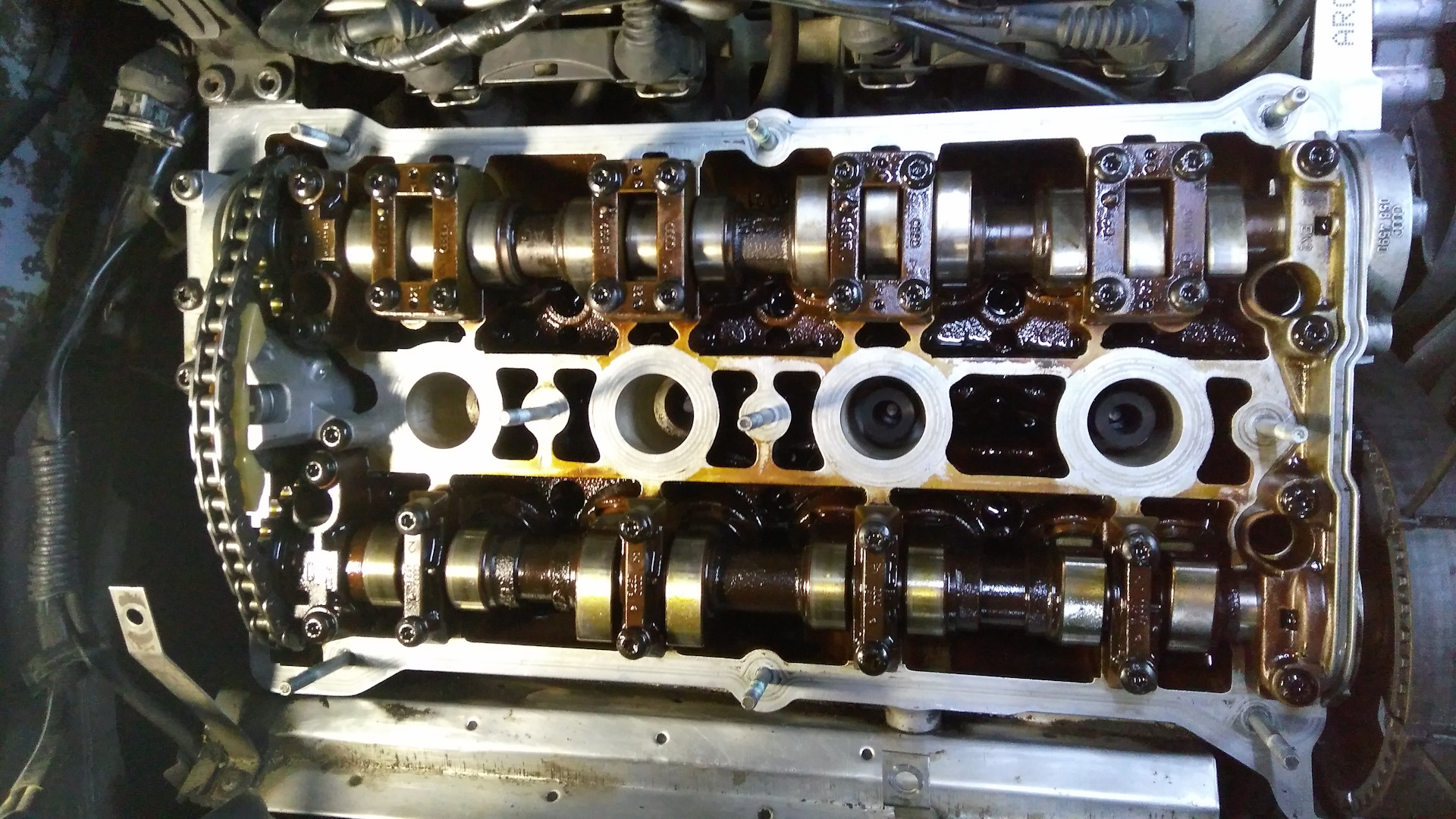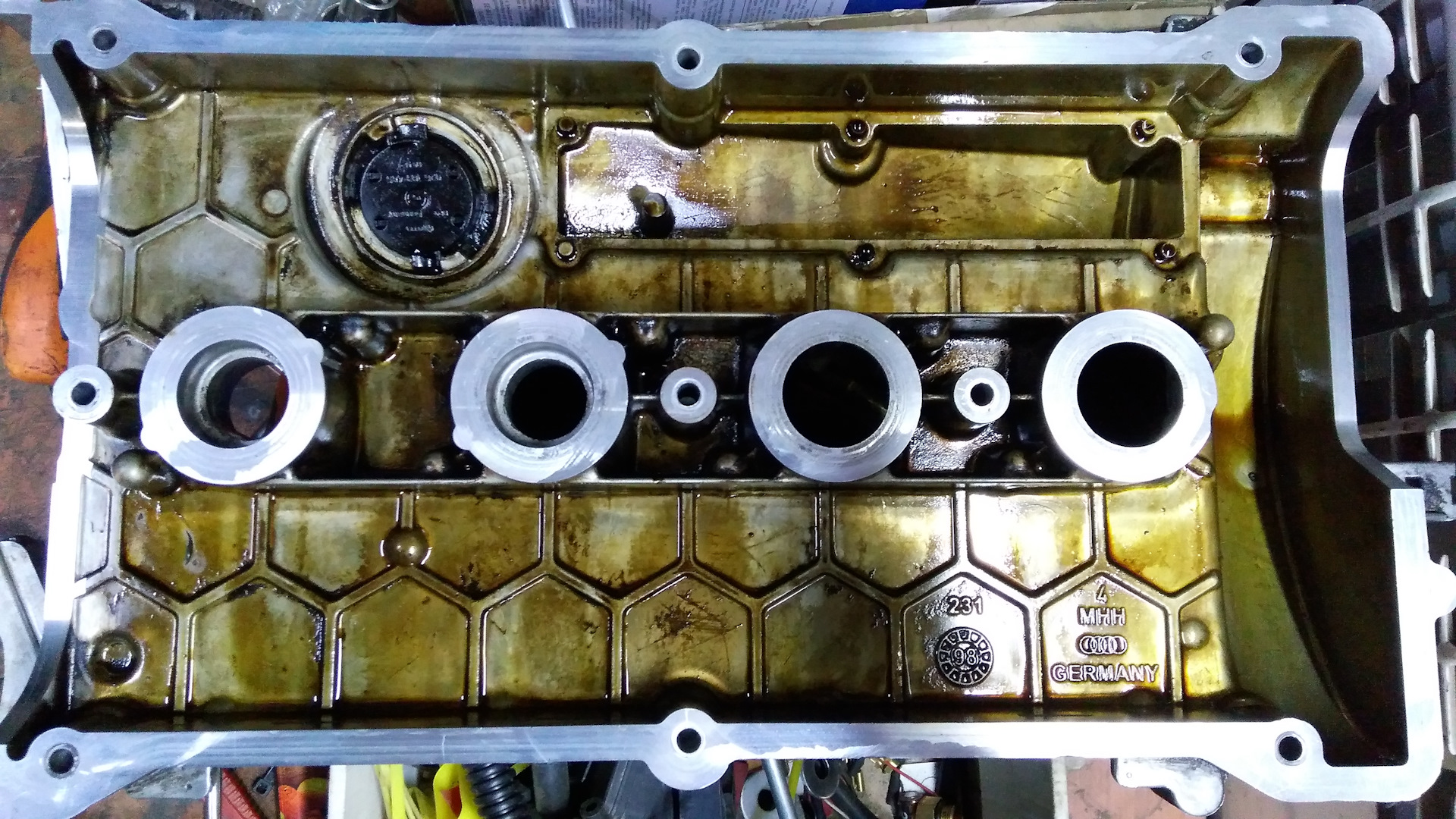 Возвращаем распредвал на место, при этом смазываем маслом места посадки бугелей и кулачки. Я заменил сразу сальник на распредвале. Итак, когда распредвал на месте, все прикручено кроме крышки, — я сделал паузу, выпил бутылочку пивка, чтоб гидрики просели, вывесил колесо, и прокрутил несколько раз, чтоб проверить метки… Метки на местах всё, хорошо. Обезжириваем клапанную крышку и место посадки прокладок на голове и прикручиваем клапанную крышку на место. И вот он момент запуска…, было страшно…Раздался какой-то стук, усрался, заглушил, побледнел. Пошёл смотреть… Перепутал провода на свечи, косяк))), возвратил всё на место. Запуск… ииииии — всё отлично, двигатель работает хорошо. Поездил пока немного, но разницы в разгоне не почувствовал, но самое главное, что нет звука дизеля. Нужно будет подсоединится, посмотреть ошибки.Читал, что нужно прошиваться после такой процедуры. Так что — ждите продолжения!