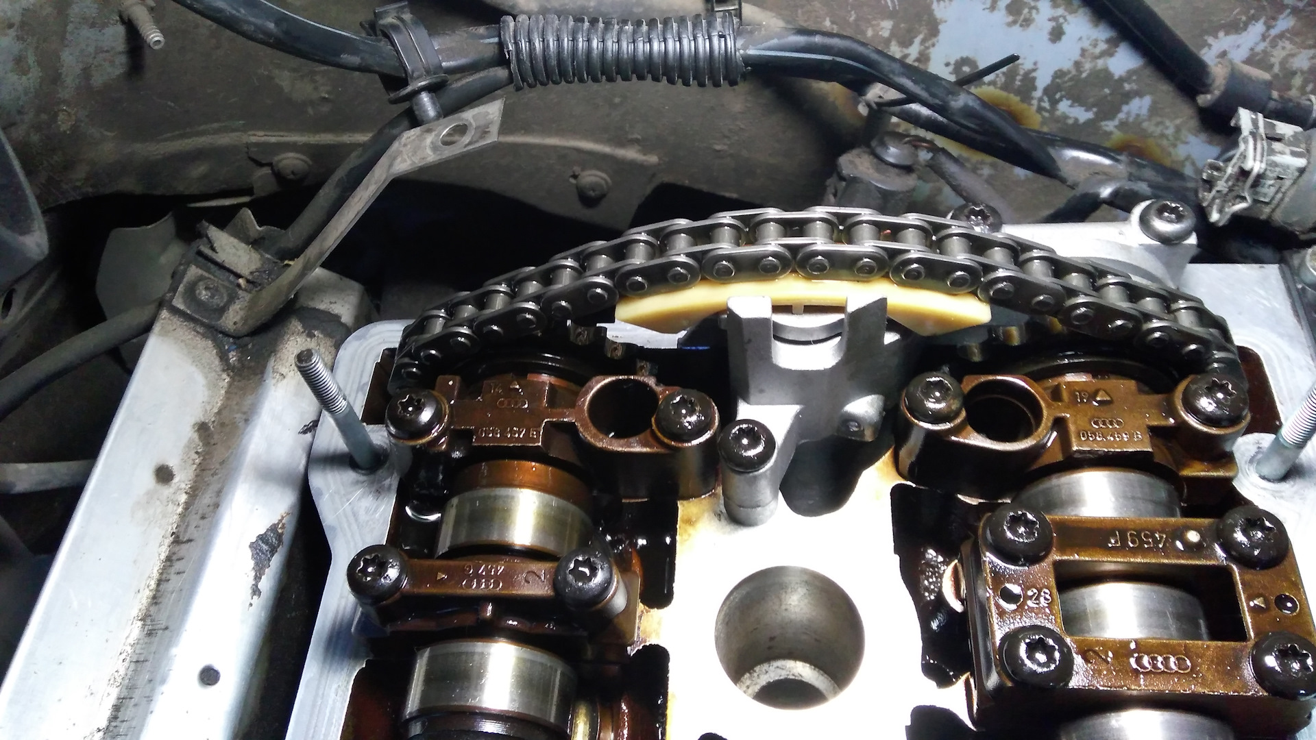 Процесс сильно описывать не буду, информации хватает. Выставляем всё по меткам, специальной приблудой сжимаем ГНЦ, которая идёт в комплекте с новым, скидываем только впускной распредвал, чуток шевелим и вот ГНЦ у нас в руках. Обезжириваем края головы, куда сядут прокладки, не забываем о прокладках под новый ГНЦ. Специальную приблуду возвращаем на новый ГНЦ, сжимаем и ставим на место старого, при этом отсчитываем по меткам 16 валиков цепи