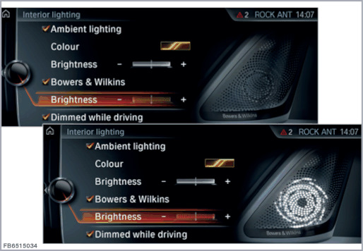 С помощью контроллера (CON) на центральном информационном дисплее в меню Настройка света "Bowers & Wilkins" можно выбрать 3 вида подсветки. В распоряжении имеются следующие настройки: