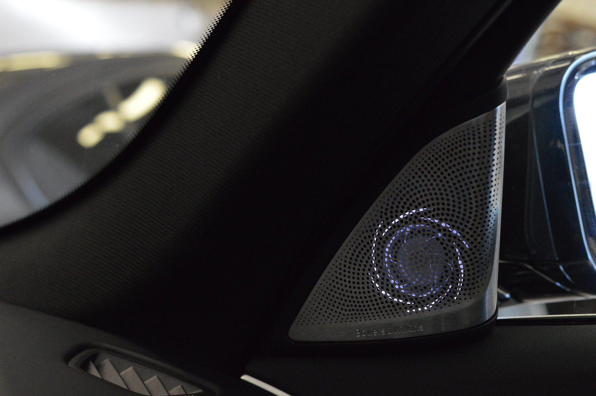 — Освещенные высокочастотные динамики (Nautilus Diamond) в треугольной накладке зеркала