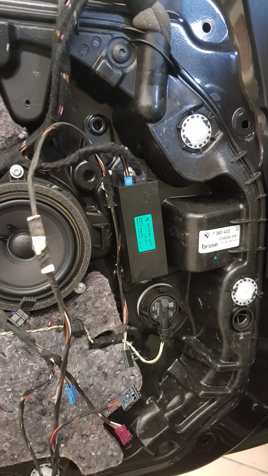 После основных работ, настает очередь установки самих сеток в карты дверей. Муторная часть при установке, это обшивки задних дверей. Так как на базовой акустике не предусмотрены динамики в задних дверях. Потребовалась резка отверстий под динамики и решетки. Так же протяжка проводов в самих дверях, из за их отсутствия. Процедура установки агналогична установки harman kardon, за исключением прокладки проводки под подсветку сеток. А это было самой муторной частью! Вся подсветка подключается последовательно, то есть в один пин светодиода входит а из другого выходит и входит в другой. Звучит вроде не стремно) Но проблема в том что сделано все намного сложнее чем кажется. Подключение идет: задняя левая дверь — передняя правая — правая задняя — правая передняя (динамик — пищалка не стал описывать).