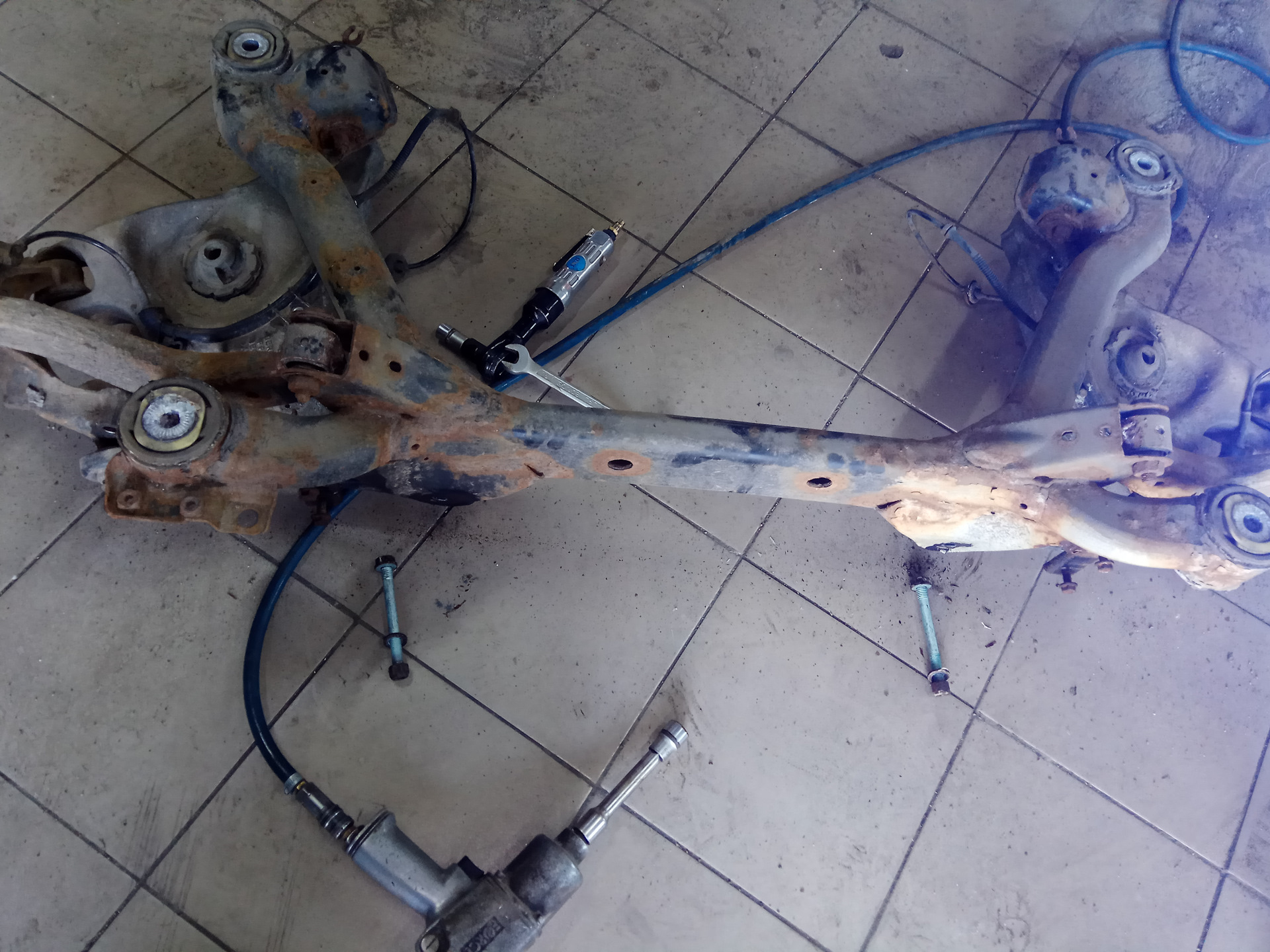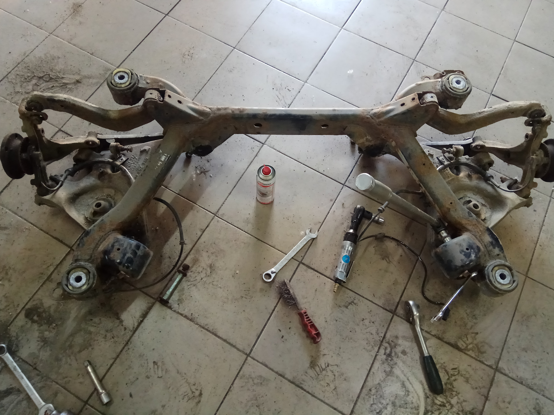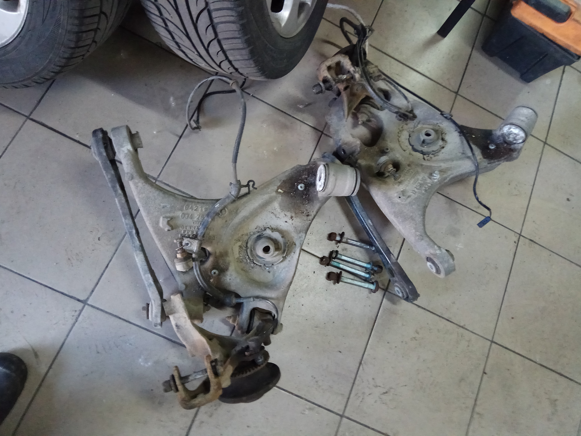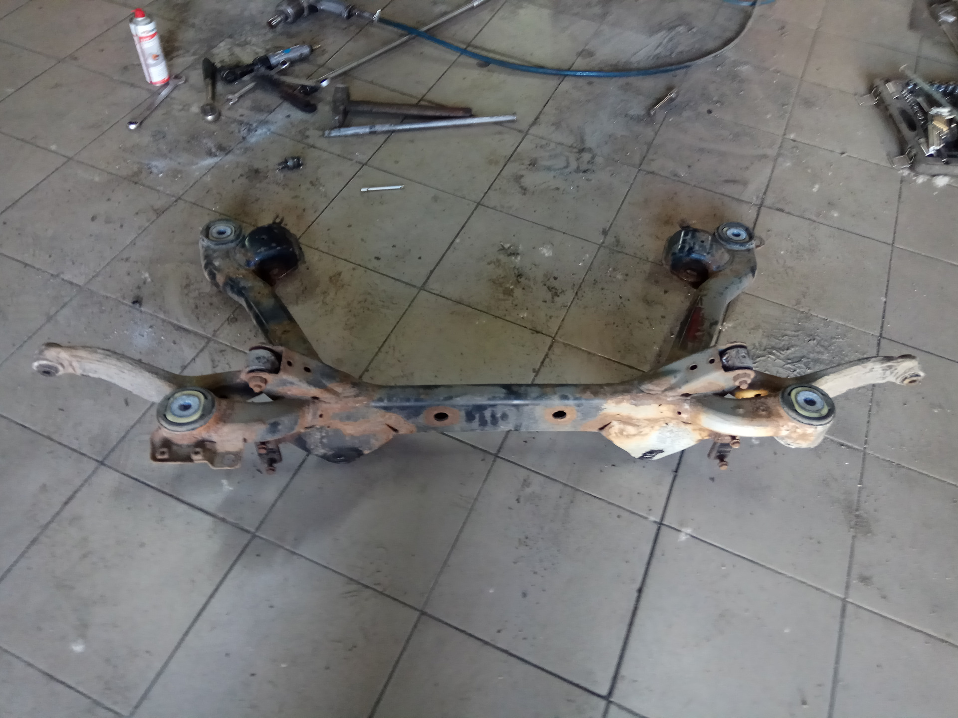 За последний месяц было проделано много работы по машине. Т.к. ездит она много и каждый день — решил перебрать всю подвеску. Начал с задней части. Снял колёса, открутил суппорта и отключил датчики АБС с тросами ручника. Открутил два болта снизу стоек и четыре болта задней балки и — задняя балка на полу…
