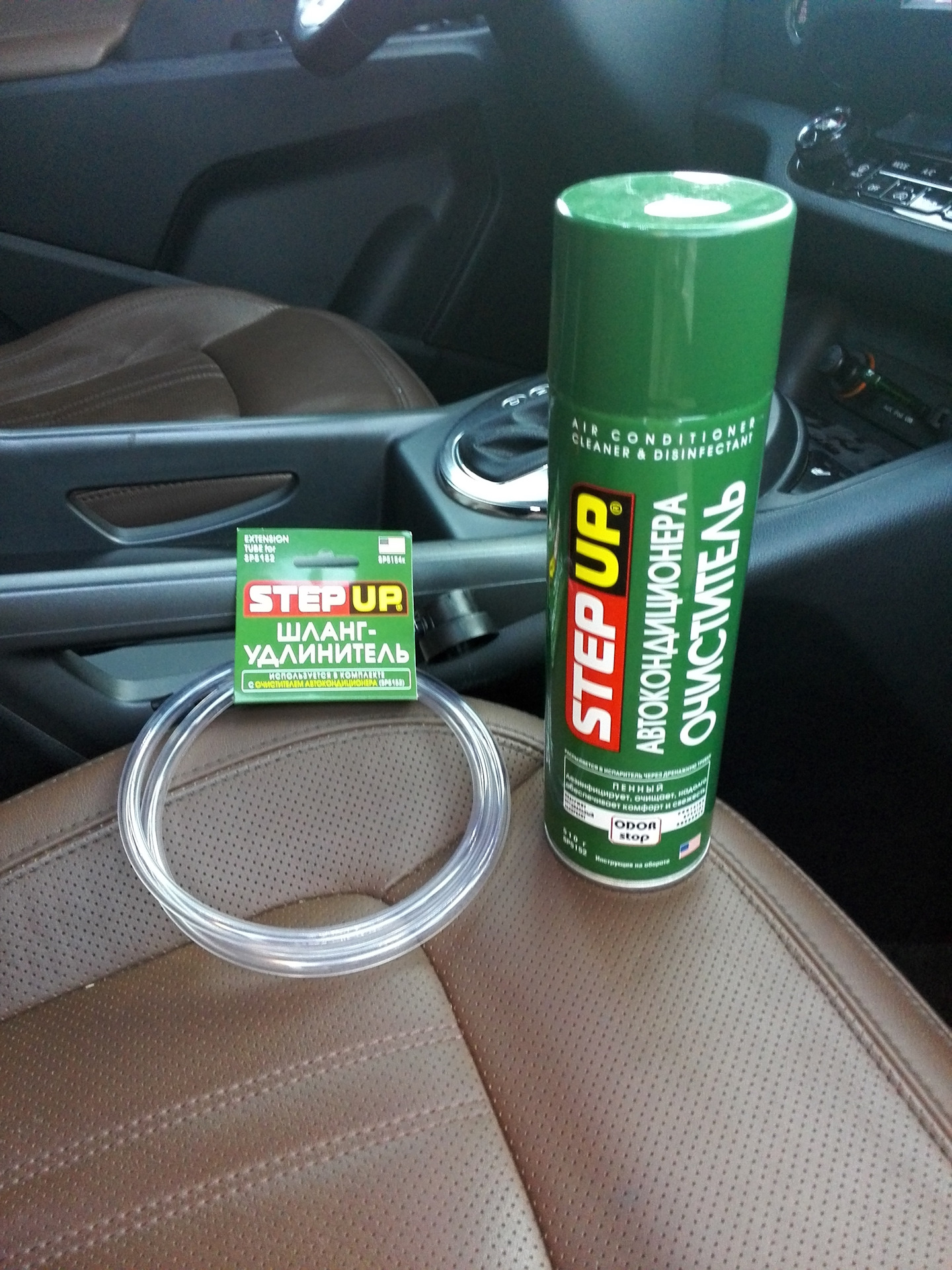 При выключении кондиционера и продувке вентилятора, стал замечать запах плесени. Заехал в один из сервисных центров по обслуживанию автокондиционеров, где мне поставили вот такую приблуду у ног переднего пассажира, и в течении часа это средство испарялось, мотор работал, кондиционер пыхтел в режиме рециркуляции.