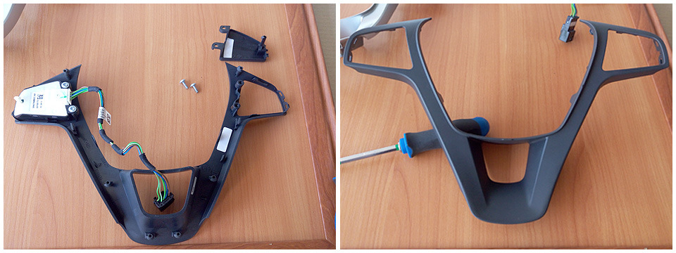 Для этого отвернув 2 самореза крепления заглушки и 2 самореза крепления блока кнопок управления ММС оставляем пустую Реевскую накладку. То же самое проделываем с накладкой от Весты.