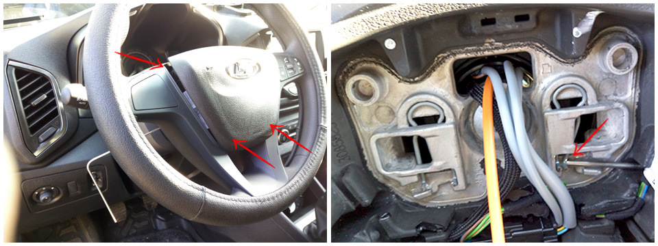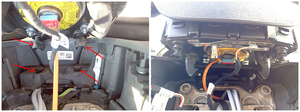 Когда подушка приподнимется с двух сторон, ее нужно аккуратно тянуть на себя, потому как в нижней части она дополнительно сидит на двух "грибках" (указал стрелками), которые погружены в резиновый состав основания руля. Тянется довольно туго, поэтому снимать нужно аккуратно, чтобы ненароком не вырвать разъем и провода подушки и сигнала.