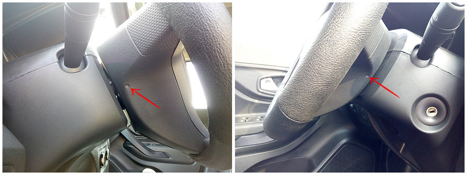 Можно конечно, как делают другие, использовать "плоскую" отвертку или пруток диаметром миллиметров в 5, но именно для того чтобы сильно не "раскурочить" там все — использовал пруток потоньше. Так же сделал по одному вертикальному надрезу скальпелем по середине технологических отверстий, так пруток аккуратно заходит внутрь и не рвет резиновое покрытие основания руля.