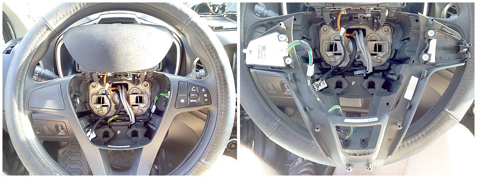 Полностью снять подушку не получилось, как и многие не понял как снимается колодка подключения, ломать не стал, просто развернул подушку на 180 градусов и положил на кожух руля сверху. Далее аккуратно снял накладку с кнопками управления ММС, делать это лучше на прогретом салоне или после того как машина постоит на солнце и нагреется салон и руль — резина основания становится мягче и накладку снять, не сломав "грибочки" крепления, гораздо проще. В общем снимается она легко, главное тащить равномерно со всех сторон и по чуть-чуть, тогда точно все останется целым.