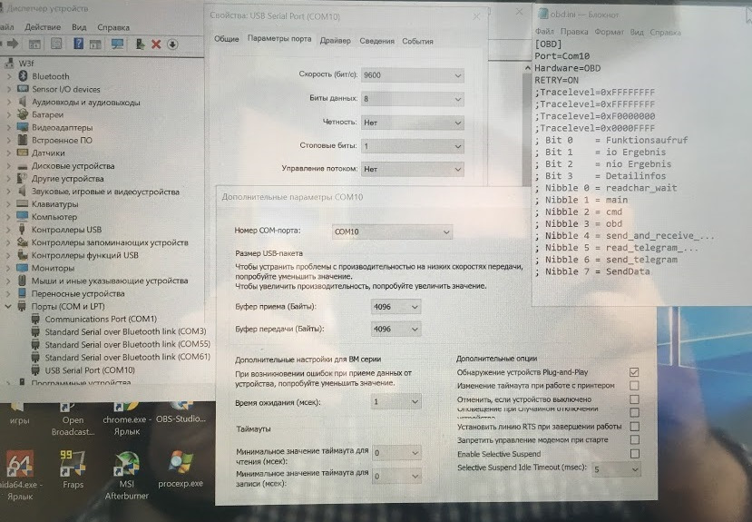 — проверяем настройки порта и их соотвествие obd.ini