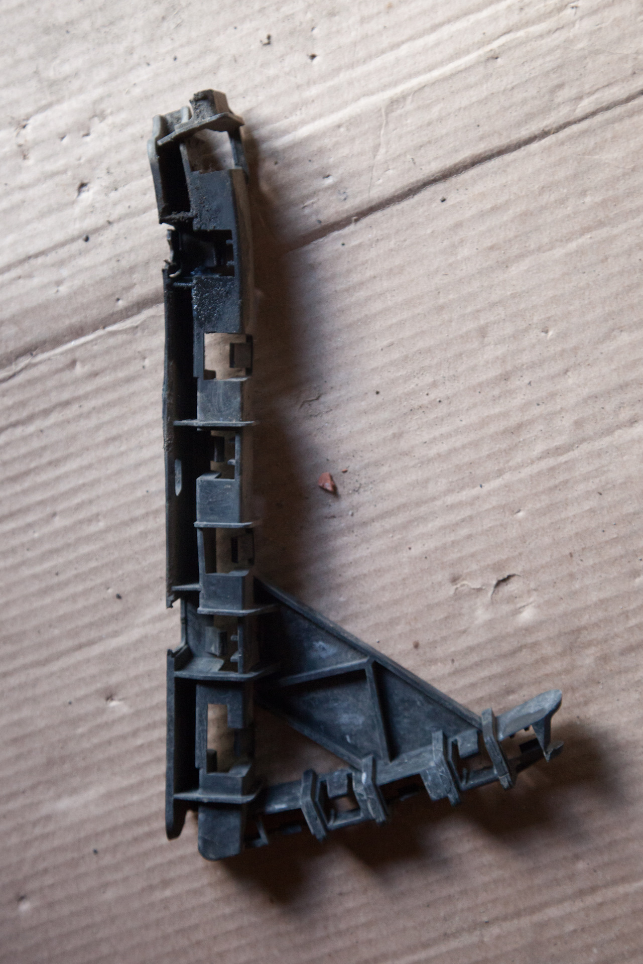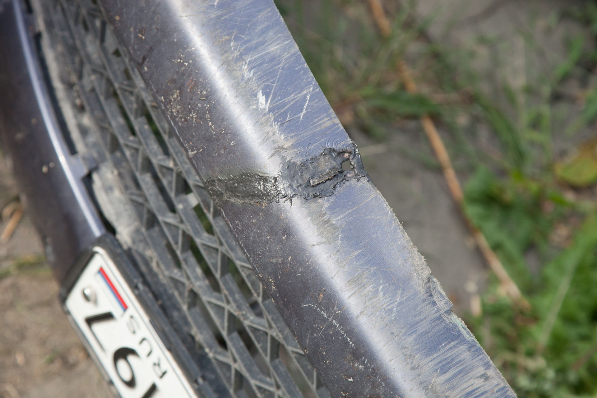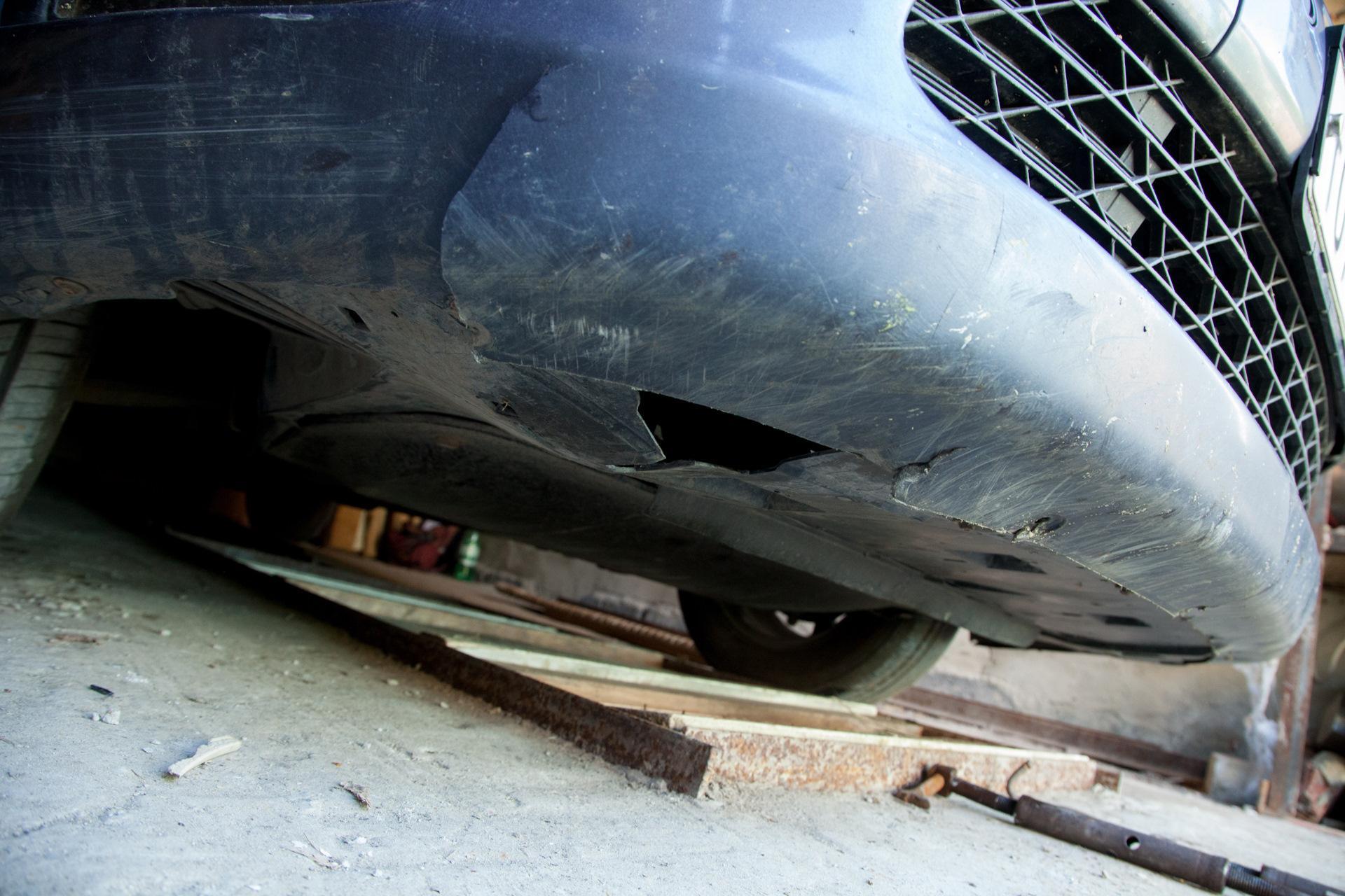 Собственно, главная цель, ради которой я его снимал. Машину купил уже со слегка растресканным бампером, зимние сугробы усугубили ситуацию, весной трещин было уже 3 штуки, но полностью он, к счастью, не разломался. Также повырывало пластик в местах нижних болтов крепления, все это я и собирался исправить.