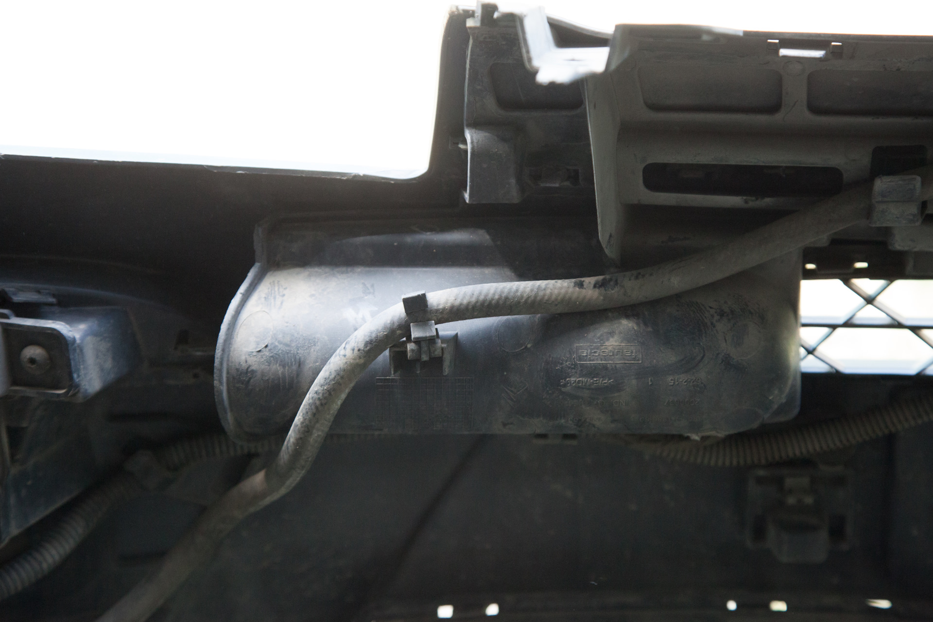 Только обрабатывая фотографии заметил, что на левом конце бампера во внутренней решетке есть места для втыкания разъемов, чтобы они не болтались. А заодно наверное туда можно воткнуть "лишний" разъем для защиты от влаги. У меня такой есть, синенький. Подозреваю, что это система контроля за полосой движения, которая у меня отсутствует.