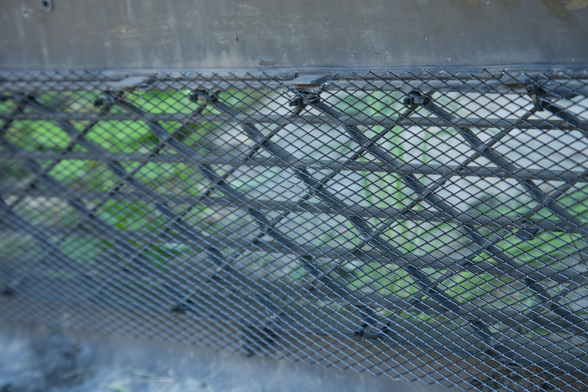 Следующее дело — противомоскитная сетка. Вещь нужная. Совсем недавно меняли радиатор кондиционера на новый, а несколько мух на нем уже с тех пор повисло. Для установки сетки не обязательно снимать бампер, можно измудриться и сверху подлезть. Но так удобнее, конечно. Тут все просто — крепил на стяжки, предусмотрел место под установку фирменной зимней заглушки (у нее фиксаторы немного выпирают внутрь).