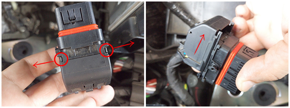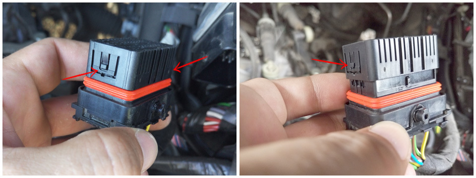 Теперь ничего не мешает добраться до двух колодок в ЭБУ. Для подключения круиза нужен доступ к нижней колодке. Для этого нужно снять сначала верхнюю колодку. Надавливаем на фиксатор…