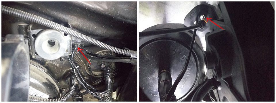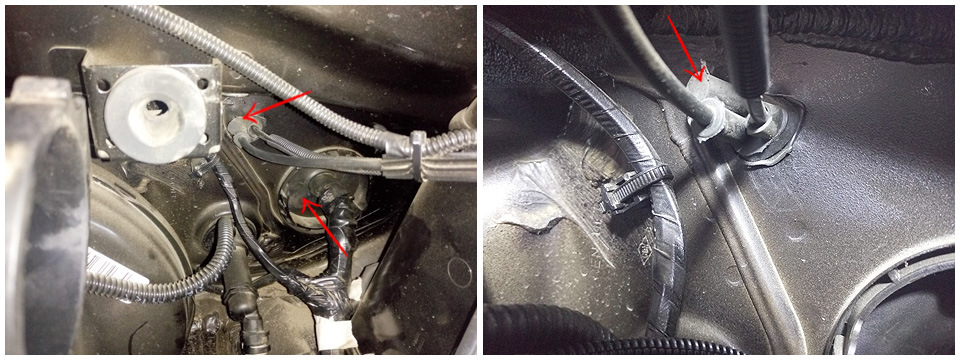 Далее необходимо завести эти 3 провода в салон. Многие мучаются с прокладкой через большую мембрану где проходит основной жгут — протыкая и потом растягивая основную мембрану и т.д. В то время когда чуть левее и выше стоит еще один резиновый уплотнитель для проводки, там где проходит тросик замка капота. У него 3 выхода, всяко какой-нибудь будет свободен. Срезаем "запаянный" конец и получаем сквозное отверстие в салон диаметром миллиметров 7-8.