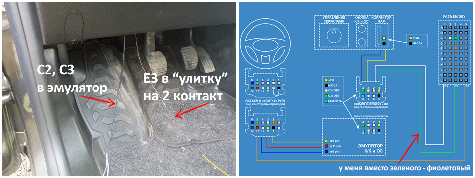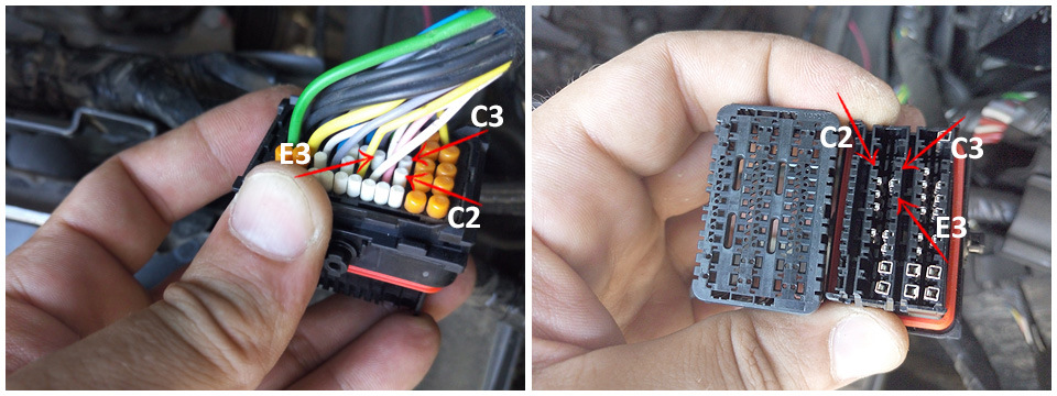 Дальше прокладываем по основным жгутам и разделяем 3 провода на 2 части: в одной провода от С2-С3 ЭБУ, и в другой отдельный провод от Е3 ЭБУ.