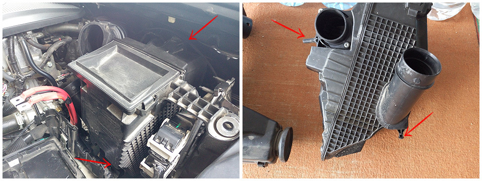 Воздухозаборник к воздушному фильтру "коннектится" трубой, которая между собой зафиксирована на защелки. Одна в видном месте, другая с обратной стороны.