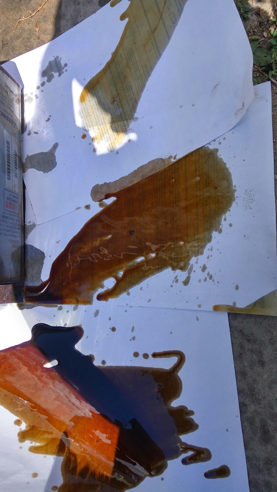 Здесь я для себя решил глянуть разницу на бумаге. Проделал это тогда, когда наводил порядок и жижа уже отстоялась в ёмкостях. Кистью брал сверху. Если смотреть сверху в низ: 1) промывка #2, 2) промывка #1, 3) отработанное масло с пятиминуткой от хай-гира.