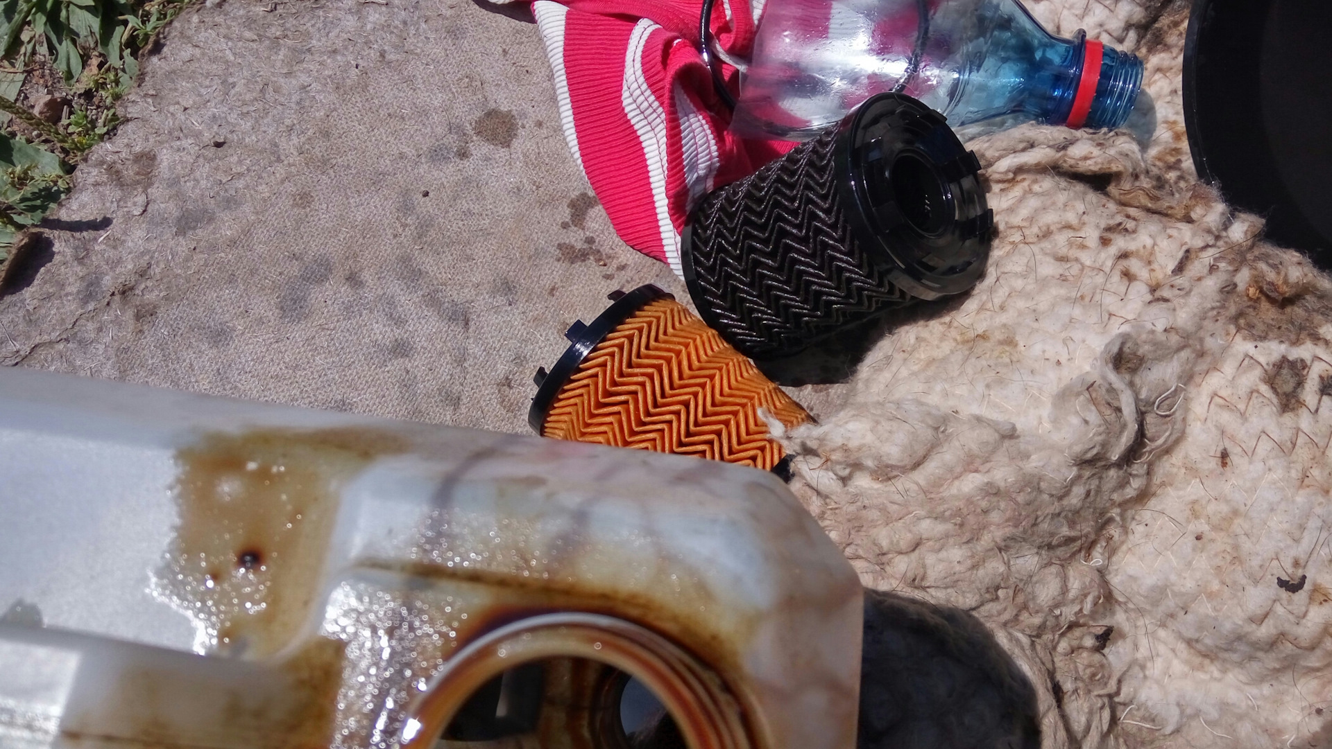 2. Установил новый фильтр. Залил промывку от Лукойл. Запустил двигатель на холостых минут на 10. Звуков посторонних не наблюдалось, обороты стабильные 800 (примерно). Сливаю, масло чуть гуще чем после хай-гира и такое же чёрное как чёрная дыра. Фильтр вынул, такой же грязный как и после отработанного масла.