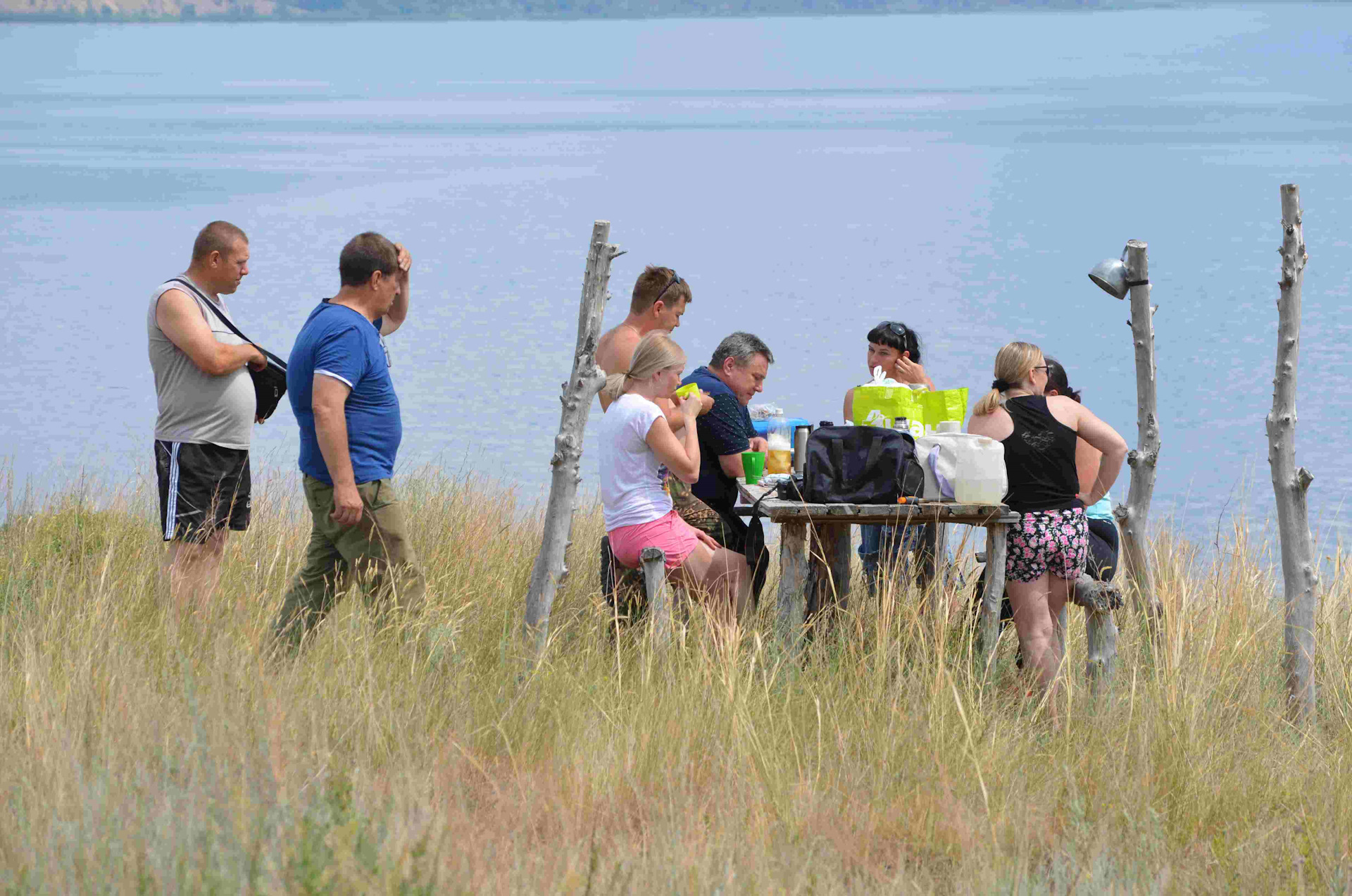 Привал на обед на обрыве за именным столом. Забыл сфотографировать табличку. Там написано кем и когда он сделан (2013год ) с приглашением отдохнуть и конечно убрать за собой