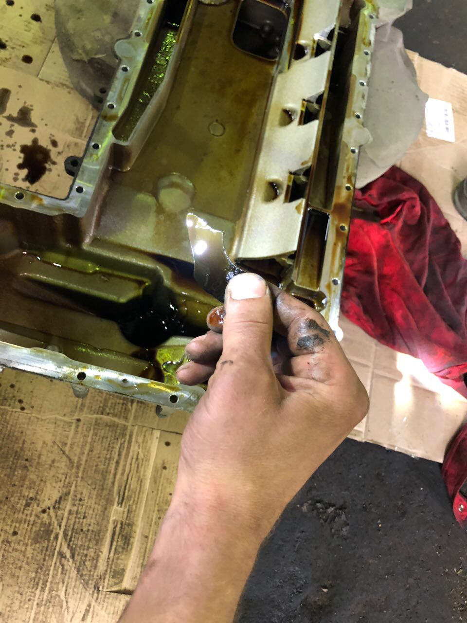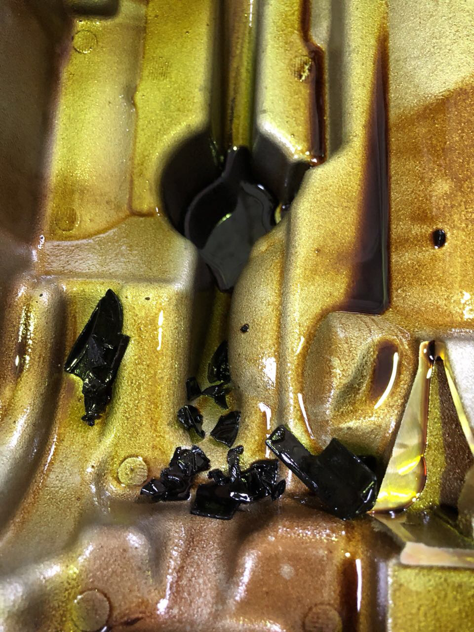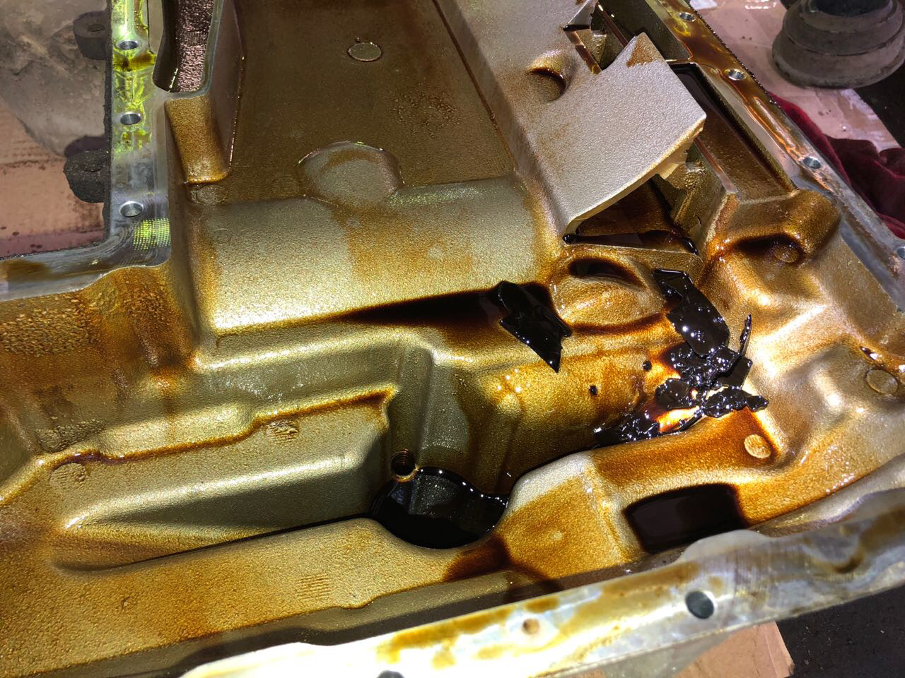 7. После этого снимаем поддон мотора. Там лежат крышки ваносов кусками. Заодно смотрим шатунный вкладыш после 50 тыс пробега на 0W-40.
