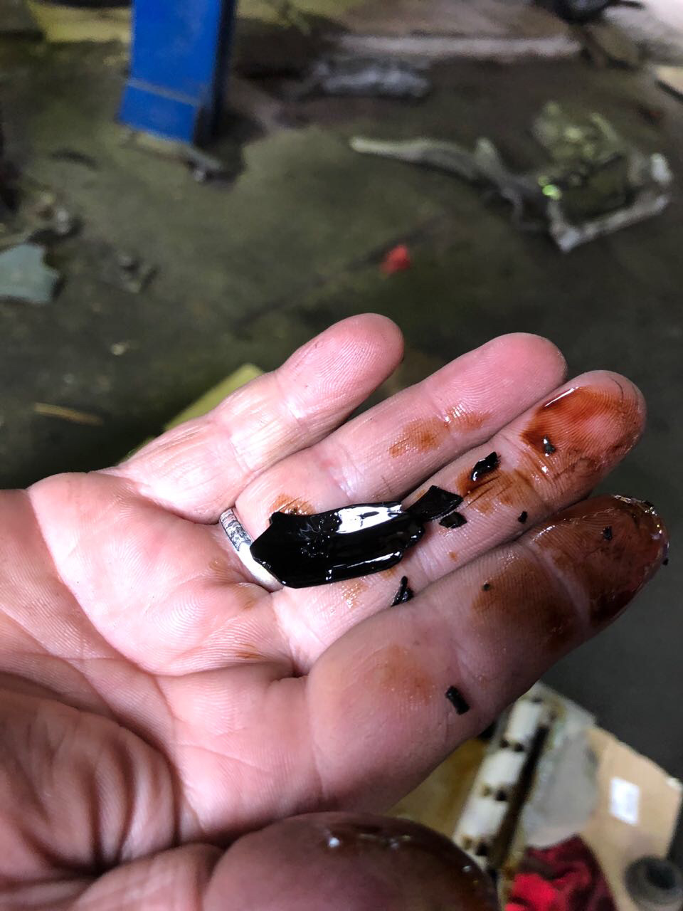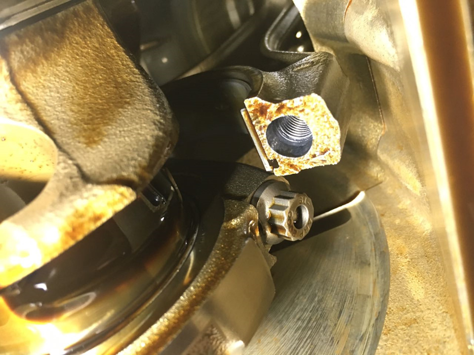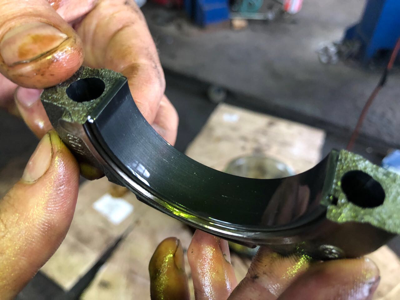 7. После этого снимаем поддон мотора. Там лежат крышки ваносов кусками. Заодно смотрим шатунный вкладыш после 50 тыс пробега на 0W-40.