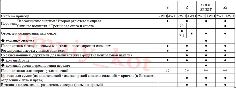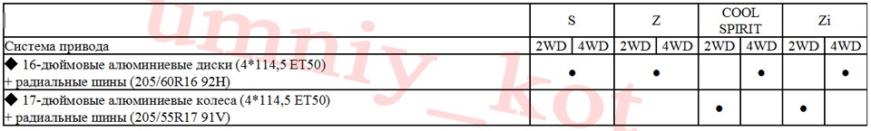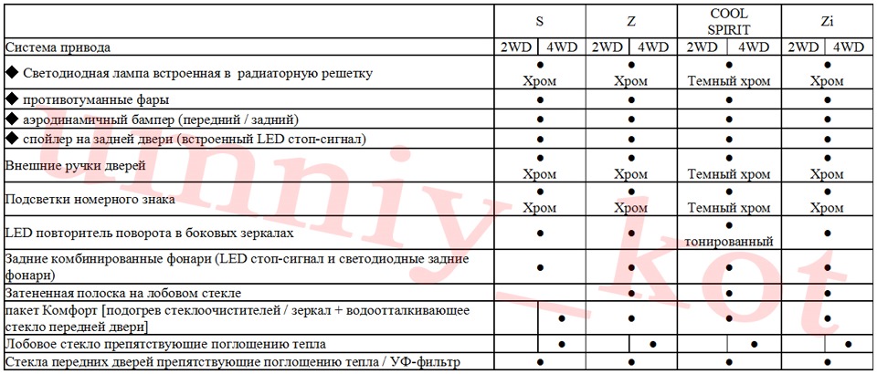 Далее на картинках в табличной форме представлены всевозможные опции для каждой из комплектаций.