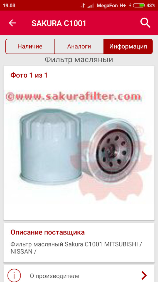 Масляный фильтр подбирал по размерам — очень меня не устраивало, что родной такой мелкий. В результате, самый крупный из тех, что удалось найти — SAKURA C1001, раза в три больше ориги.