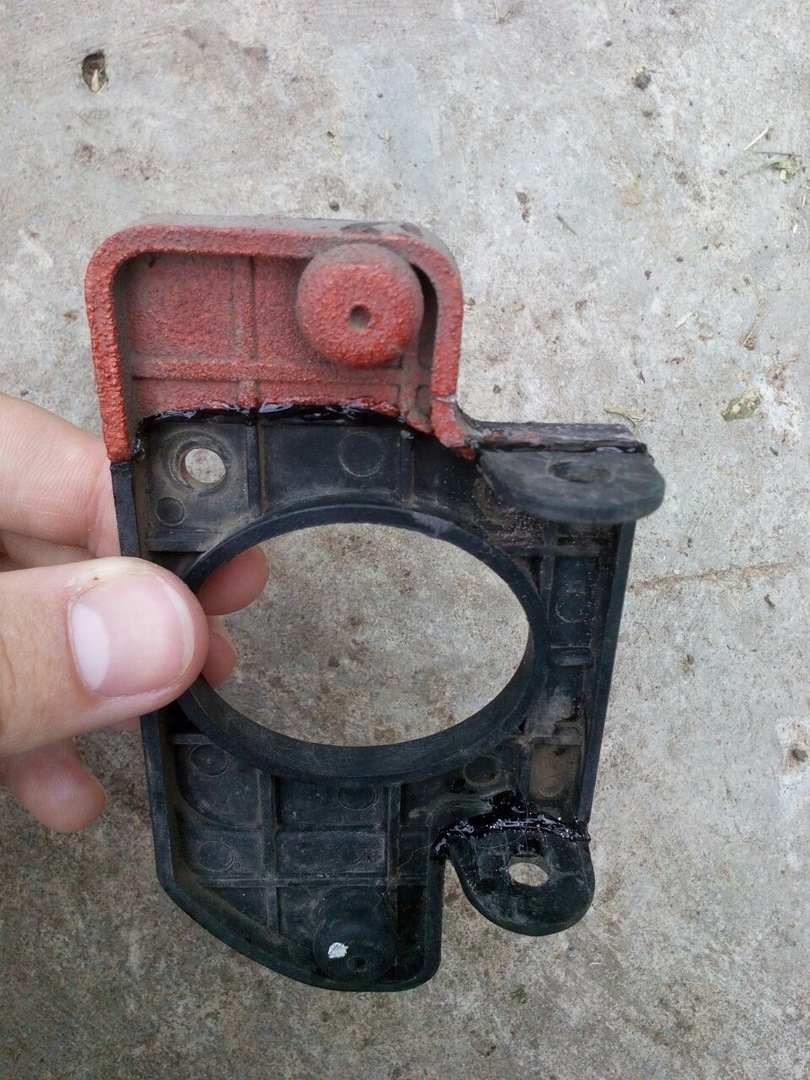 Поехал в магазин и купил маленький тюбик клея "супер момент" высоко-прочный, предварительно поверхности зашкурил и обезжирил, после приклеил.
