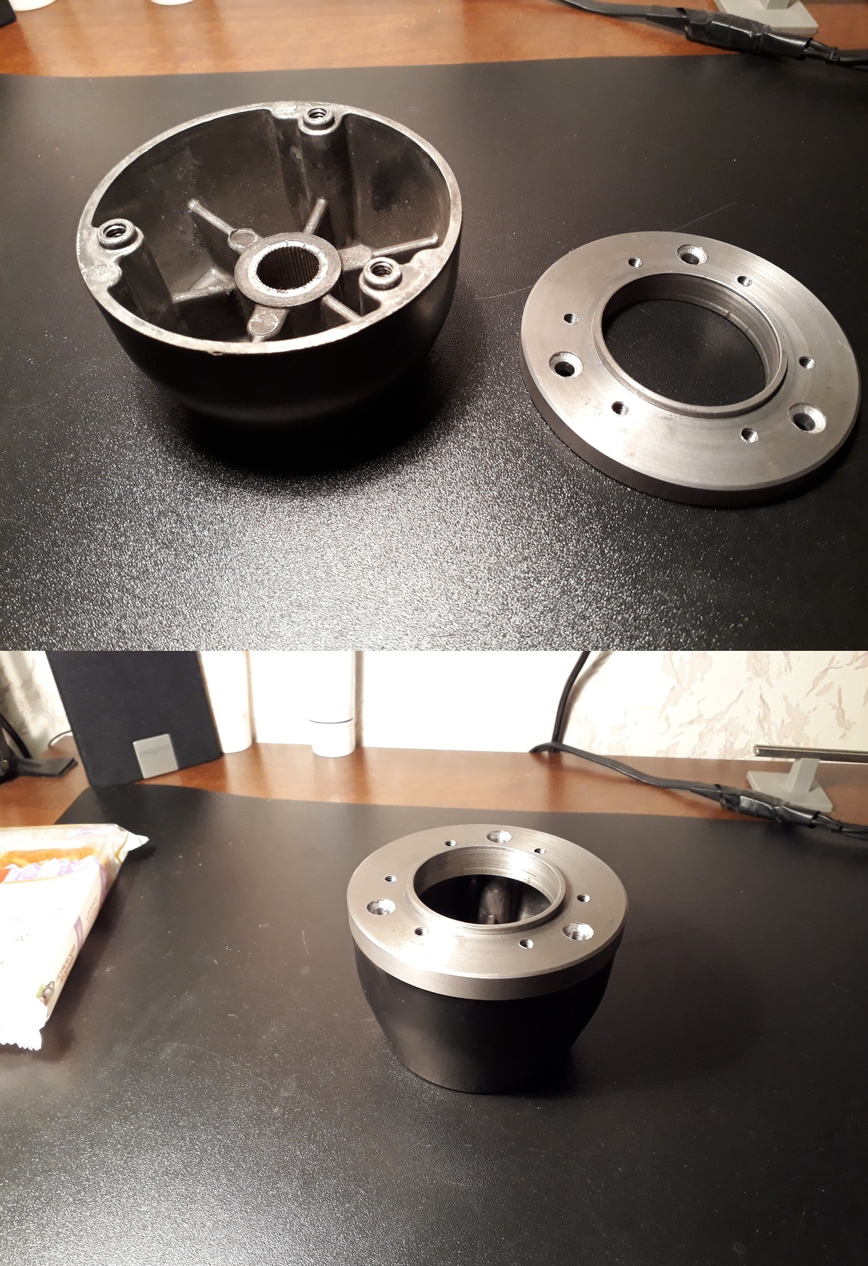 Звоню опять токарю, тот в шоке, говорит привози обратно адаптер, благо 3 болта этих он не выкинул. Рассверлил отверстие, которое было впотай, что бы можно было закрутить родные болты. Да, эти отвертсия теперь "палятся" с установленным рулем, но я хочу их просто заварить и шлифануть, и в дальнейшем покрасить, будет вообще ничего не заметно.