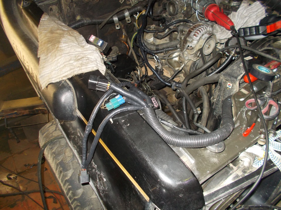 Восстановил и обезжирил провода, распределил их заново на пучки, уложил в разрезные гофры и замотал изолентой. Покрасил крыло хамерайтом. Ранее заменил шланги охлаждения масла двигателя но новые, в этот раз заменил обычные хомуты на хомуты под болт как у шлангов ATF. Изготовил из толстой пластины кронштейн крепления аккумулятора