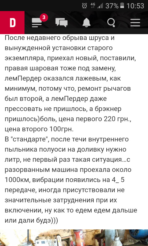 После недавнего обрыва шруса и вынужденной установки старого экземпляра, приехал новый, поставили, правая шаровая тоже под замену, лемПердер оказался лажевым, как минимум, потому что, ремонт рычагов был первый, а лемПердер даже прессовать не пришлось, а брэкнер пришлось)боль, цена первого 220 грн., цена второго 100грн.