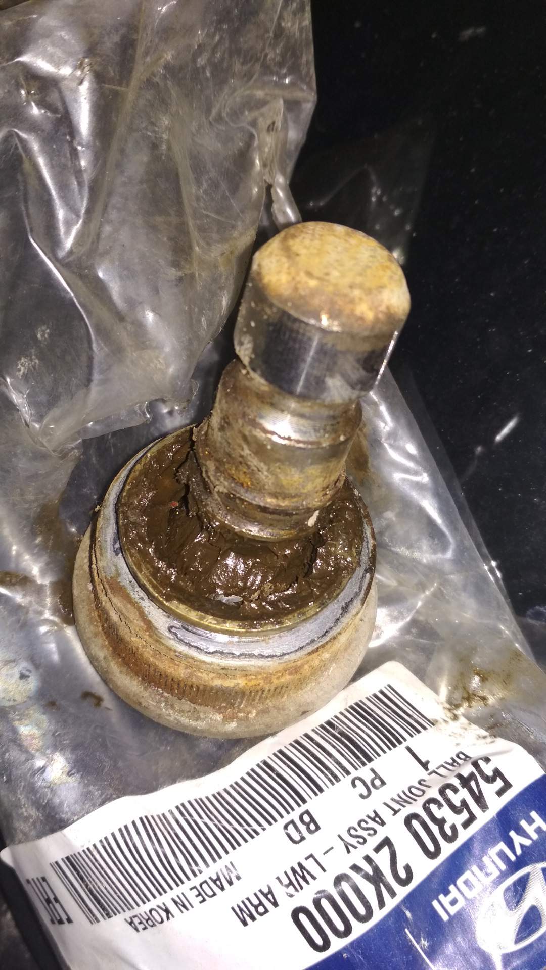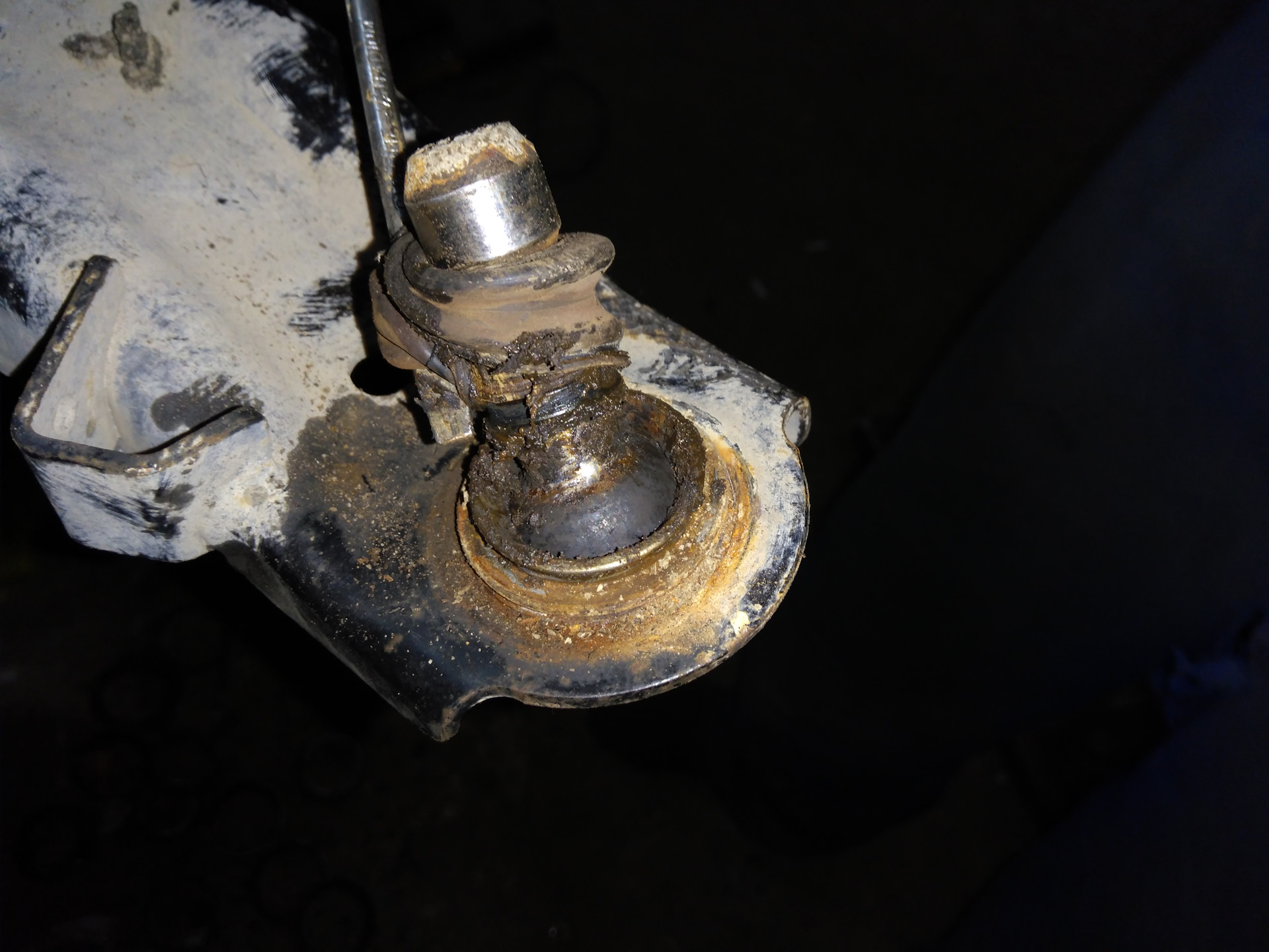 Начали разбирать… И стало всё ясно: Как я и думал — из-за долгих поездок по глубоким лужам, грязная вода попала внутрь шаровых опор. Вымыла всю смазку, добавила грязи и песочка… В общем всё по классике!
