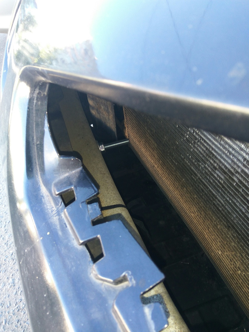 Всем до боли знакомая проблема, провисание бампера. Лечение — приподняли бампер руками, другой просверлил дырку в нем через железную балку и закрутил болт. Итог — щель в зазор между бампером и капотом в 2 см ушла!