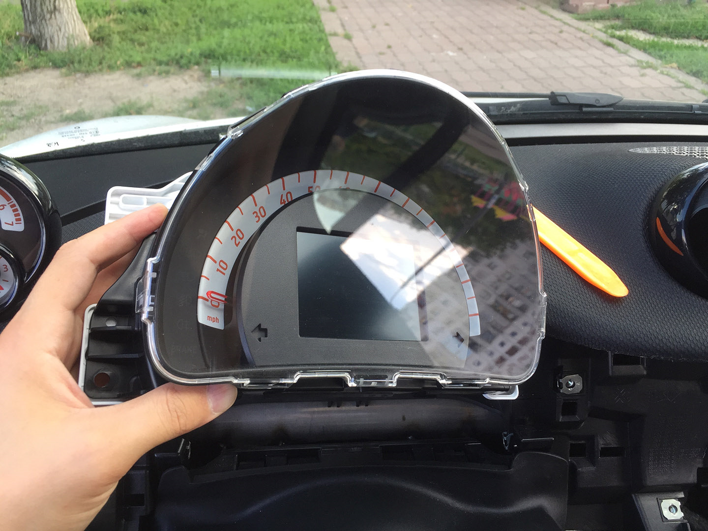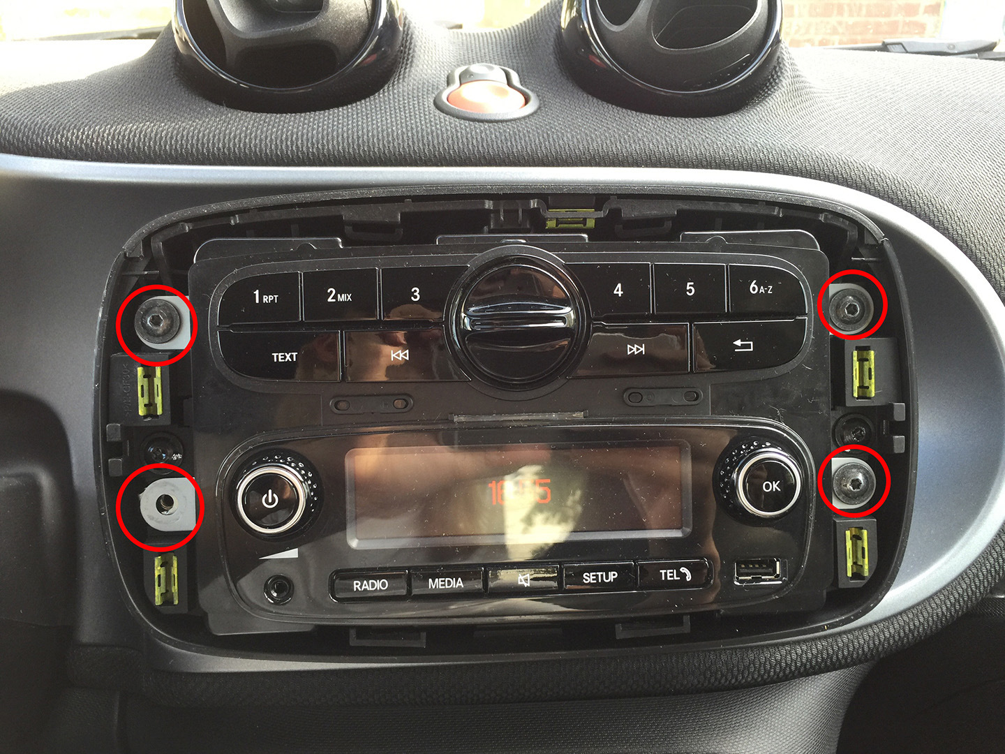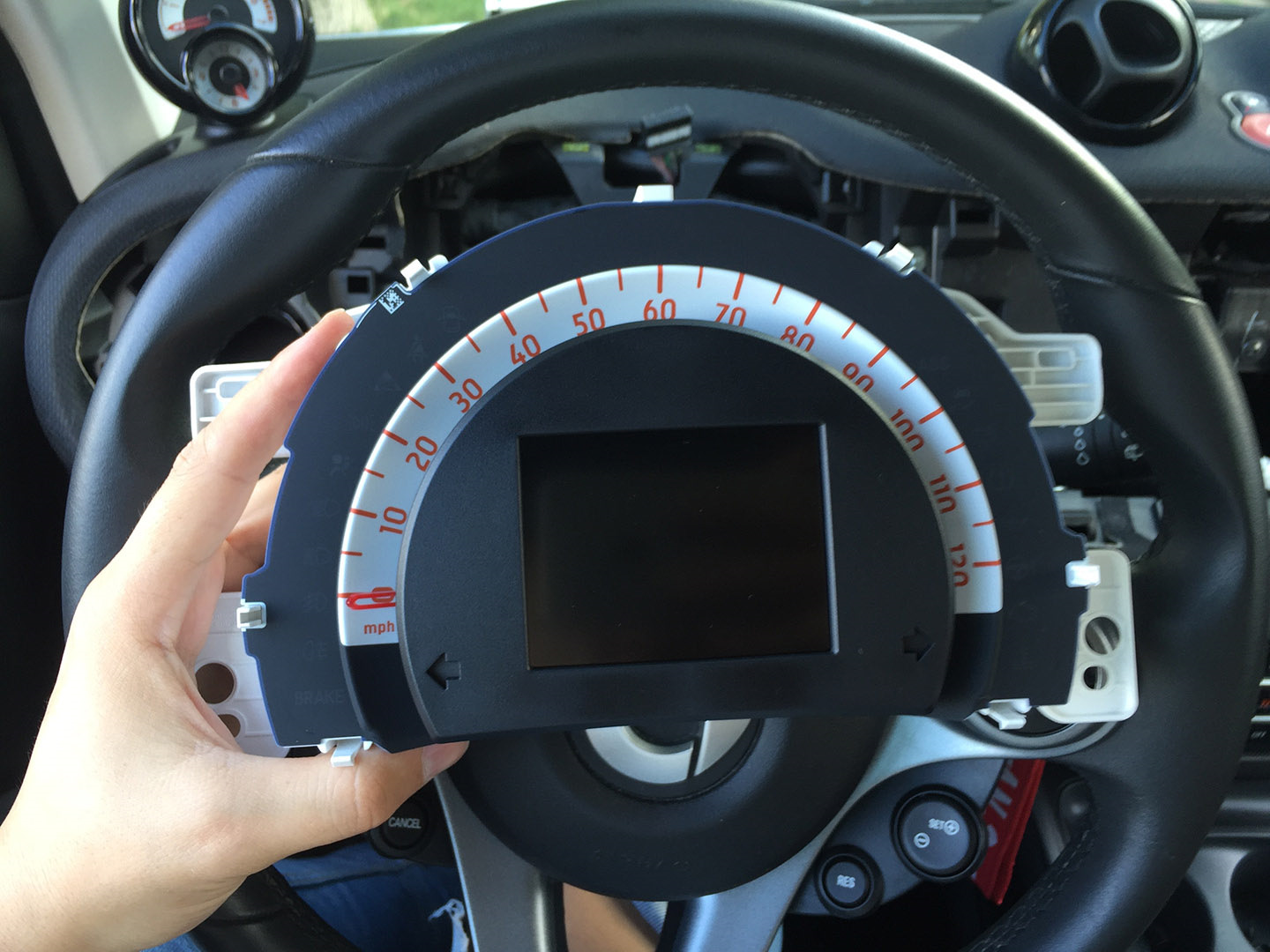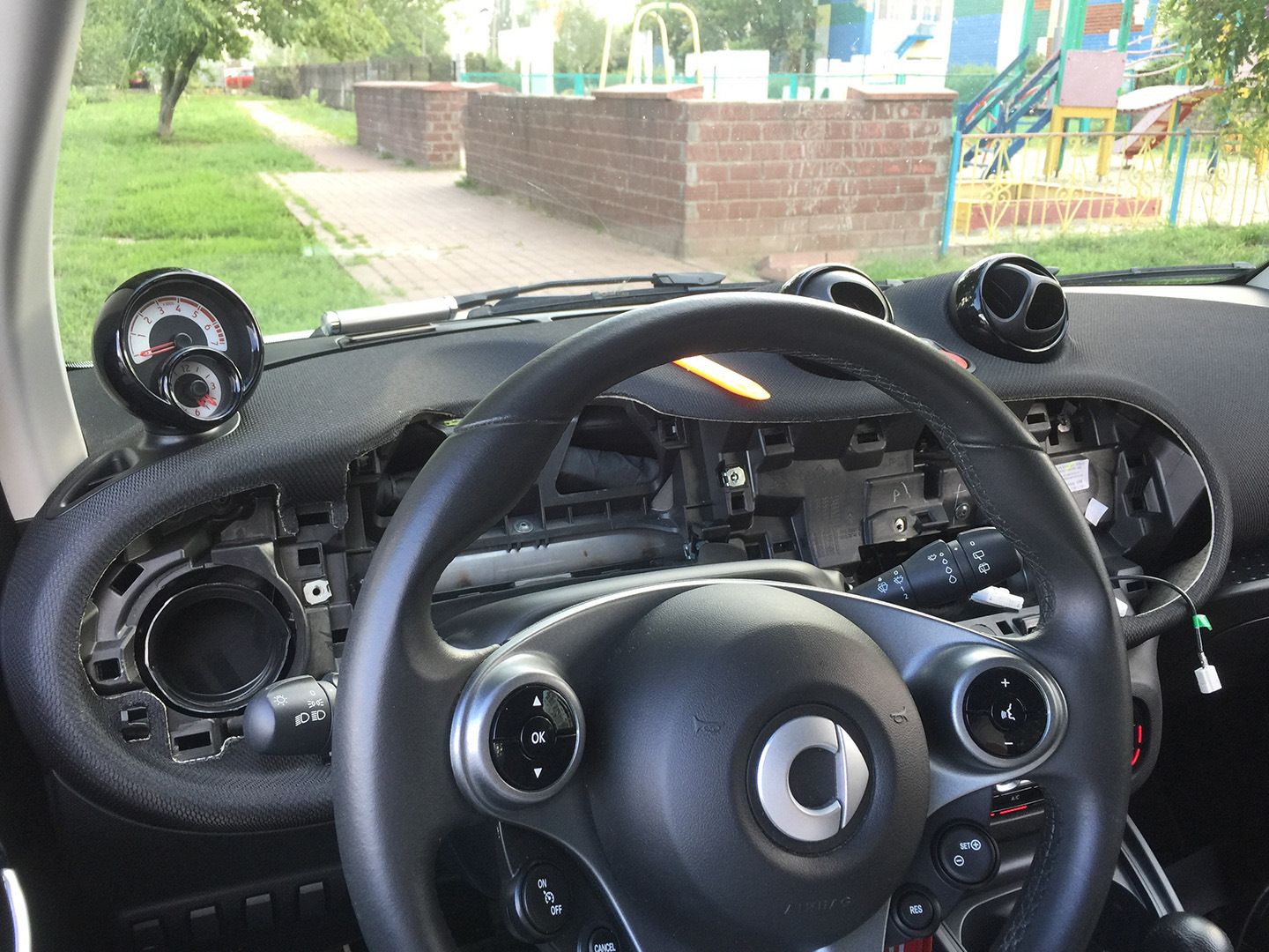 В предыдущих смартах достаточно было потянуть приборку на себя. В новом смарте всё прикручено. Чтобы добраться до приборки, нужно снять радио, подложку под радио и воздуховод слева.