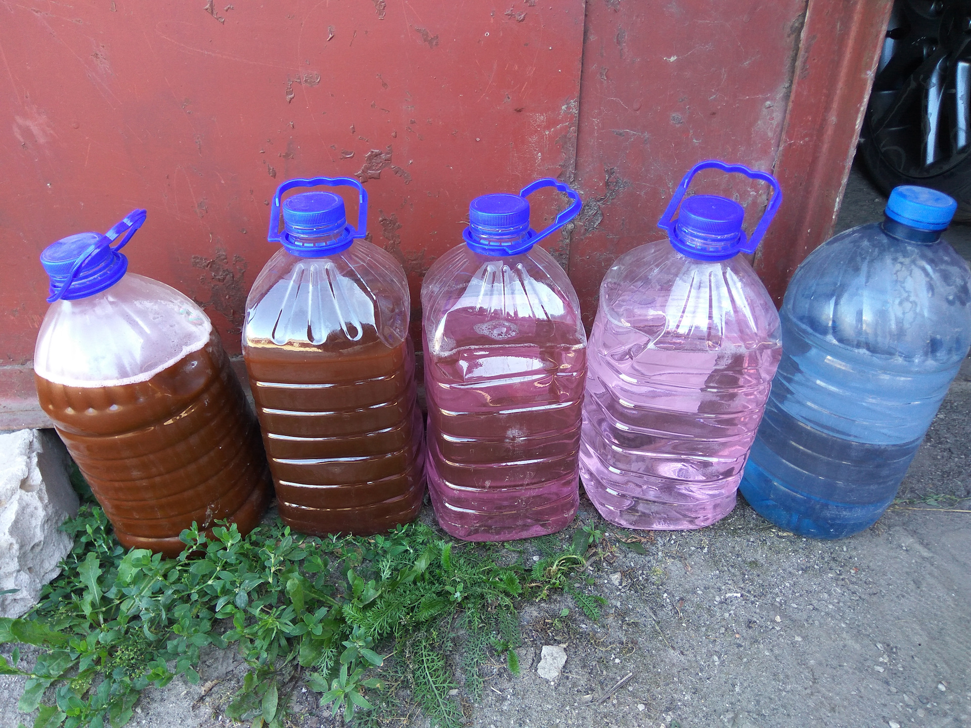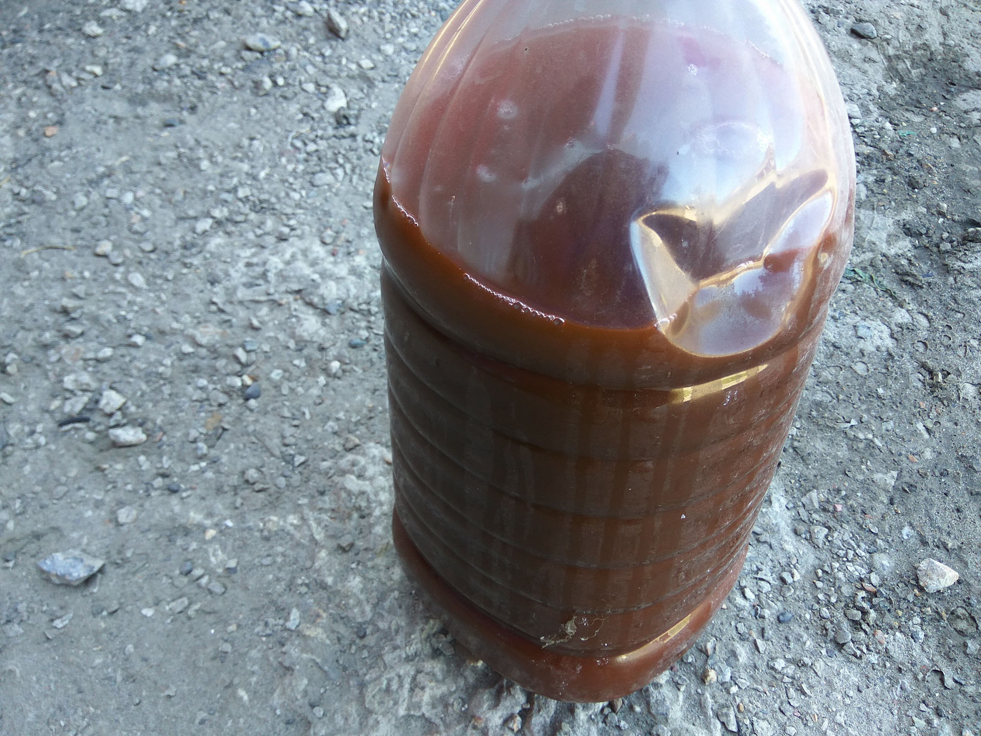 Ну вот и начал сливать его, сначала вывернул полностью кран и тем самым много разлил по полу, но основная часть все таки слилась в бутылку