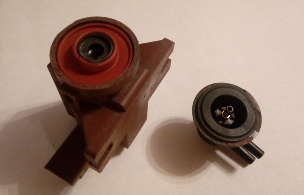 На этом клапане коричневый штуцер обломился, по фото он должен быть справа.