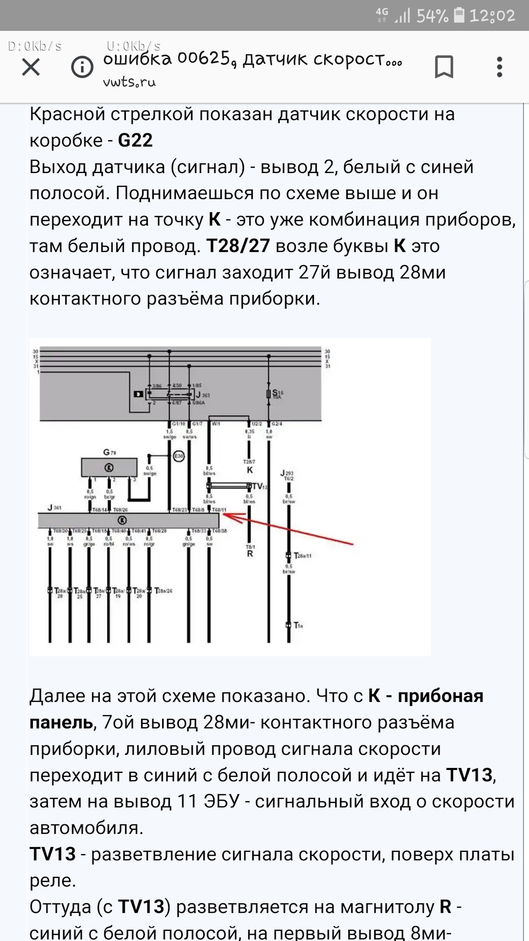 Для начала подтягиваем мат.часть по этому вопросу…почитали решения и проблеммы у разных людей.у кого зубья съело.у кого обрыв провода…Немного теории именно про шкоду октавию…Датчик скорости имеет три вывода…Два крайних это питание(черный и коричневый провод).Белый с синей полосой-сигнальный провод.на котором появляется 6 импульсов за один оборот датчика.С него идет сигнал на приборную панель в 27 пин…с приборки идет на эбу на 11 пин.Лезем под капот проверять все ли там в порядке.оказывается ранее до меня уже кто то решал эту проблему.но как говориться-не получилось.извлек целую кучу проводов которые там были намотаны и давно меня смущали.но вот добрались и до них.коричневый провод сразу же остался у меня в руках…Удаляем весь этот конфус.заодно восстанавливаем проводку как должно быть…снять сам датчик не получилось…точнее даже фишку не смог снять все как то неудобно…Решил забить пока на это дело.Все скрутили запаяли…поворачиваем зажигание…черный и коричневый -питание 12 в есть.У кого нет питания смотрим предохранитель номер 7 в блоке предохранителей в торпеде…Берем ноут.подключаемся…прокатились…эбу не видит скорости…по нулям…Разбираемся дальше…Если работает спидометр.то значит датчик тоже работает и сигнал в приборку поступает…иначе были бы проблемы со спидометром.Значит под капотом у нас все хорошо.и не надо туда пока больше лезть…И тут нашел одну статью.приложил фото…что оказывается после приборки сигнал с датчика скорости идет через некую шину на 11 пин Эбу и еще покой то черт на штатный магнитофон(возможно для навигации). Вспоминается мне что видел этот провод и думал что это антена для радио…и он подключен на +12 к мафону…лезем туда.все так и есть отсоединяем его…подключаемся к Васе.и вуаля.как и думал все ожило…отчет по ошибке 00537 будет позже.