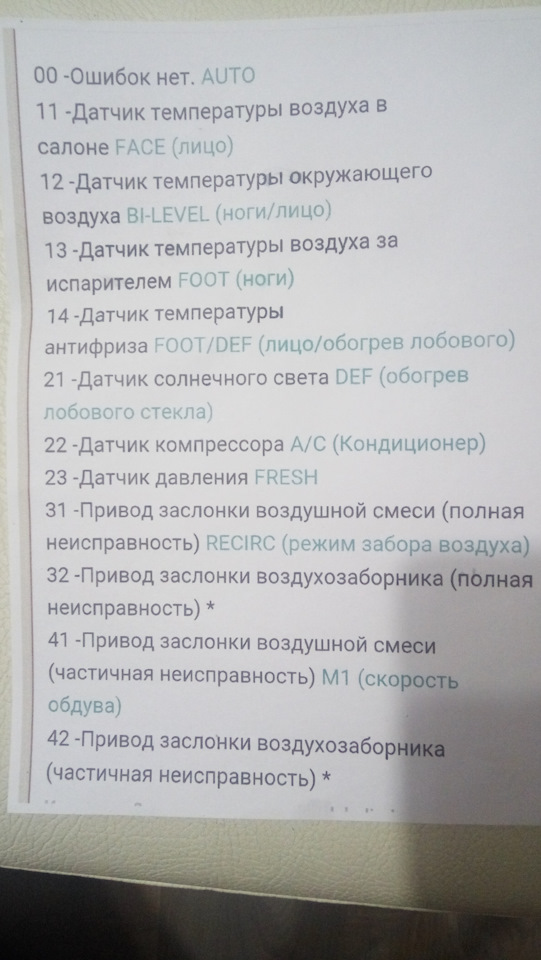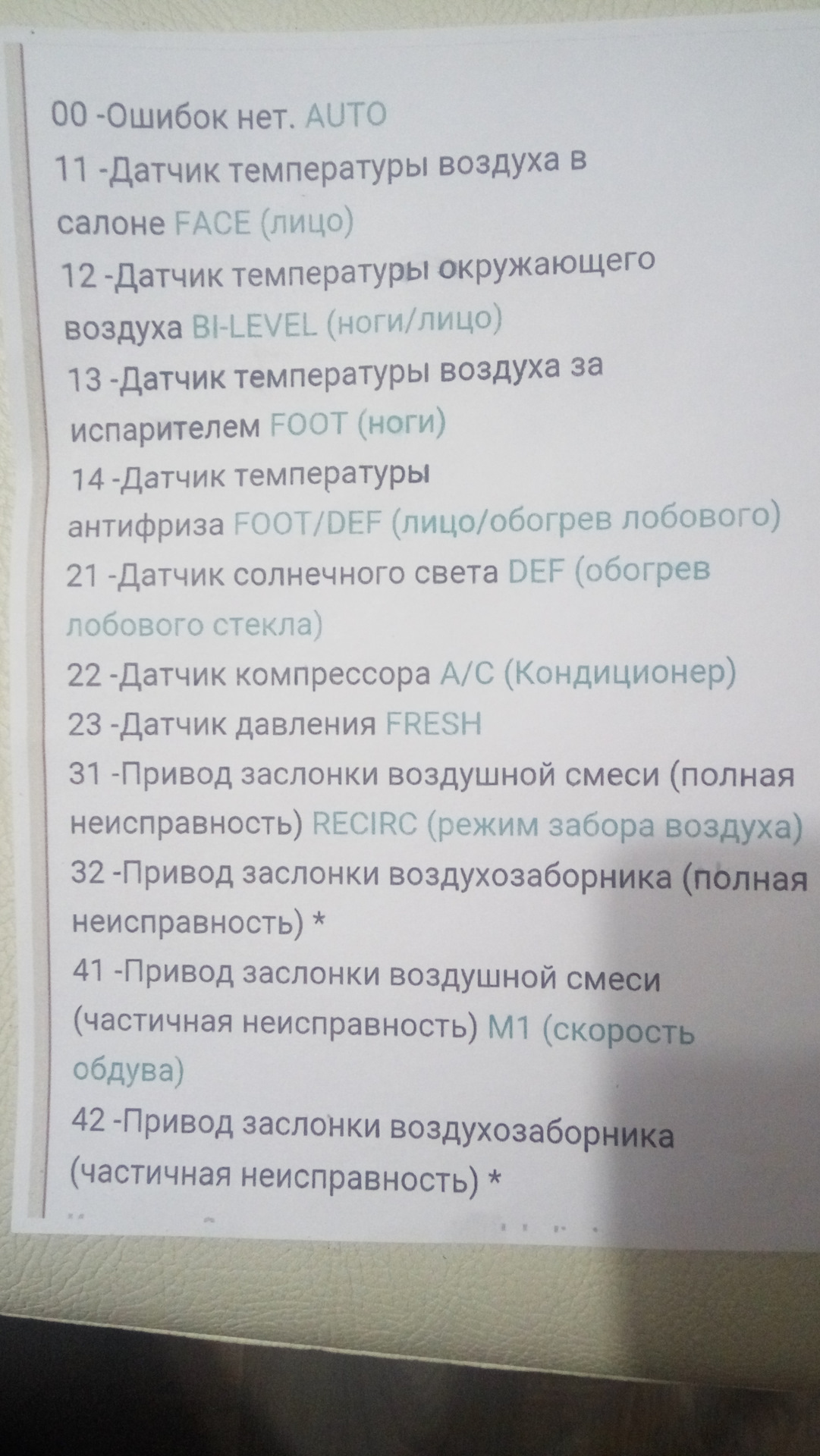Выключаем зажигание, жмём "рецеркуляция воздуха в салоне" и "AUTO". Затем не отпуская их включаем зажигание. Далее смотрим на дисплей и таблицу ошибок!