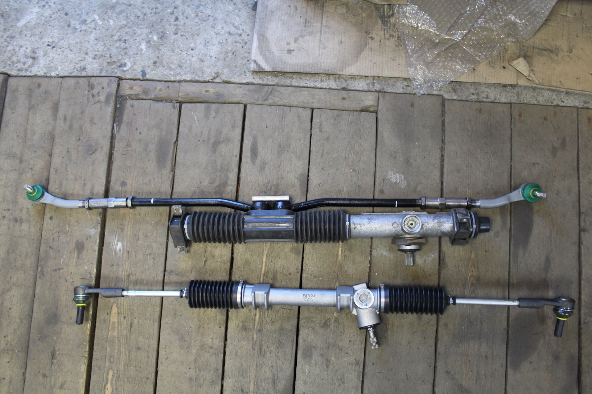 Стал думать, какую рейку ставить, что бы тяги шли прямо из основания самой рейки, что бы она так глубоко в салон не уходила. Решил купить новую рейку от ОКИ. По своим габаритам она, кстати, очень похожа на штатную рейку от морриса, которая давно благополучно отправлена в метал со всем сопутствующим.
