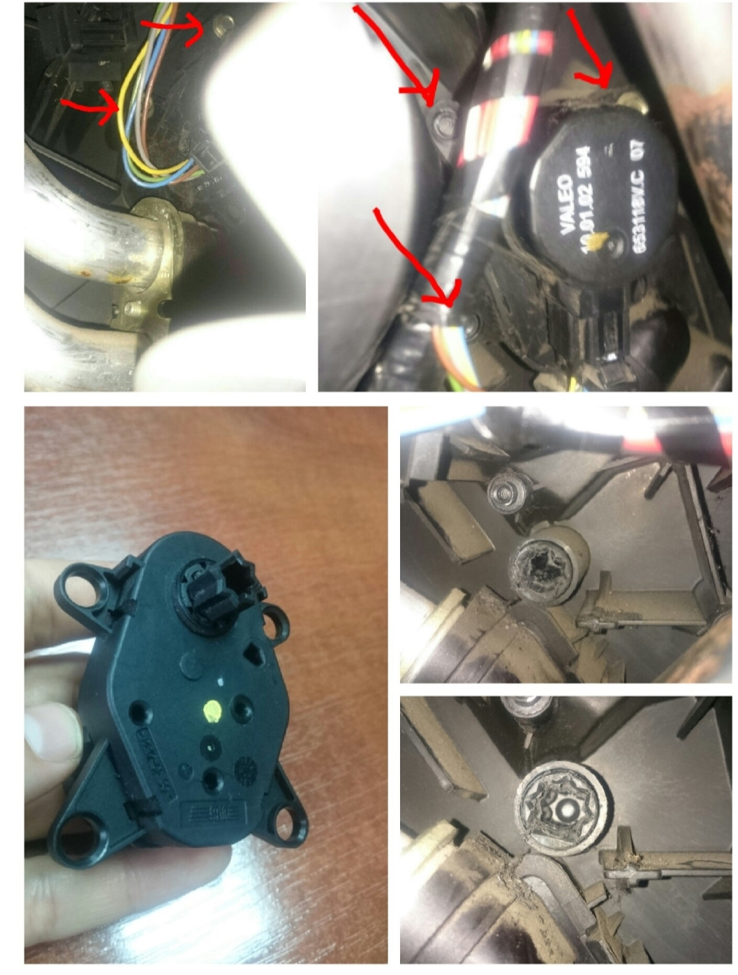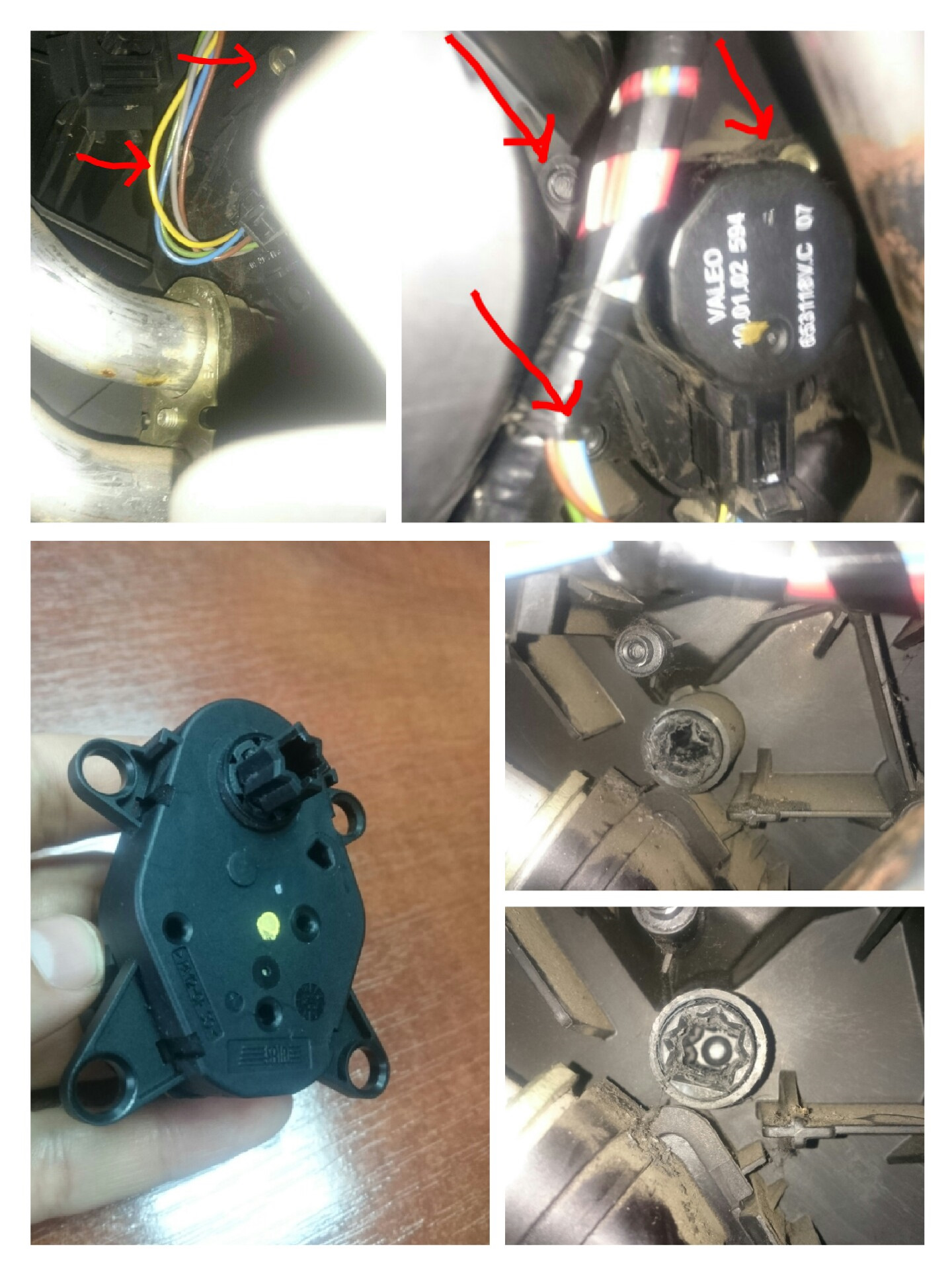 Вот на этом фото слева внизу фото моторчика, а справа внизу фото разбитого посадочного места, за которое моторчик должен вращать заслонку